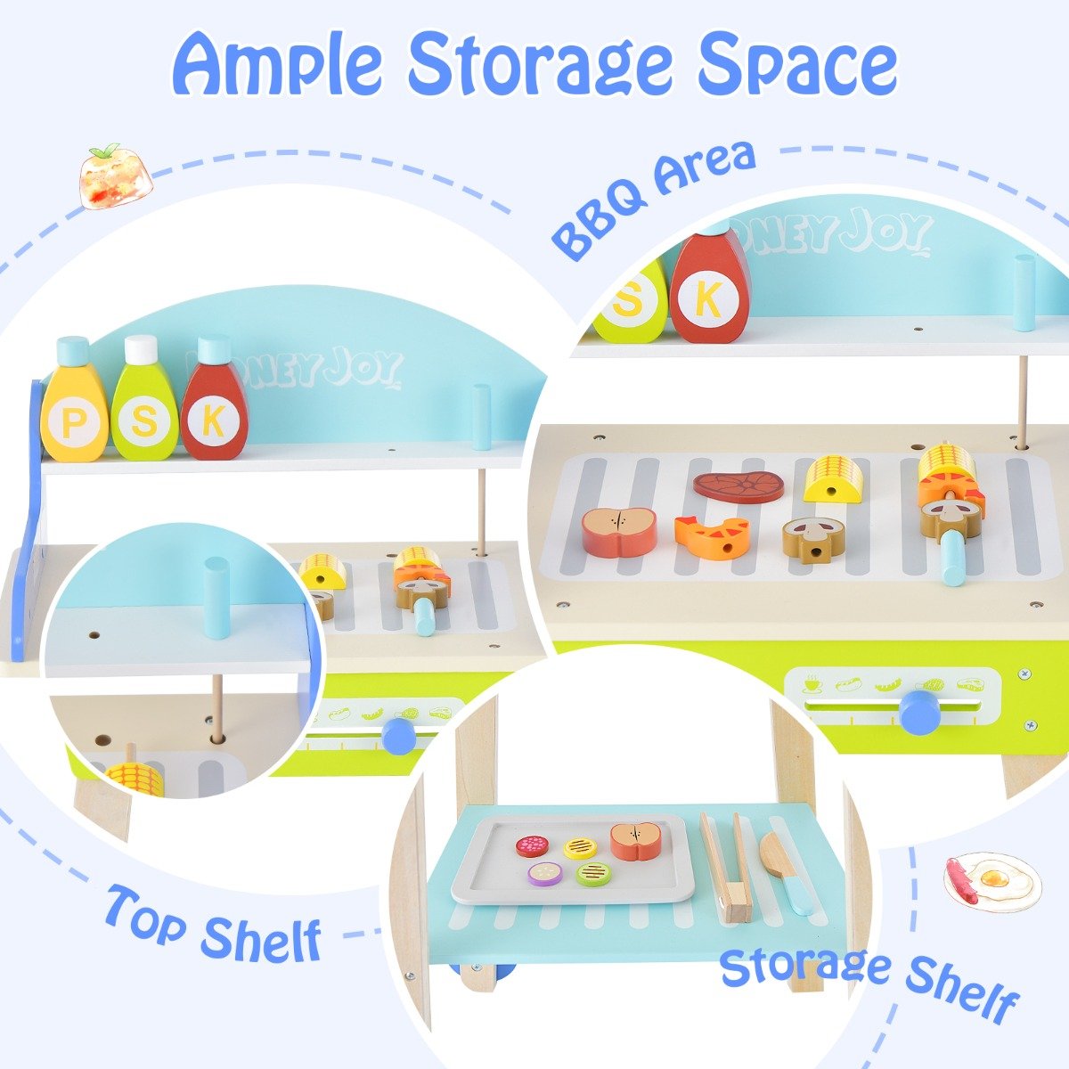 Kids can learn more about the BBQ steps and improve their social skills during their playtime. Our toy set is equipped with 1 food tray, 1 BBQ tong, 1 toy knife, 2 barbecue skewers, 3 condiments and 13 food toys. Thus, toddlers can acquire endless fun with their friends. Sufficient storage space helps kids develop a good habit of sorting out. Plus, our toy grill set has 1 push handle and 2 wheels for toddlers to move without effort. Furthermore, the whole cooking toy set has passed ASTM and CPSIA certifications, adding more safety. If you are looking for a BBQ grill play set for kids like this, do not hesitate to place an order! Realistic BBQ Grill Playset: This pretend barbecue grill set is an interactive toy for kids over 3 years old. With the BBQ grill set, your little one will skewer barbecue ingredients, add some condiments or flip the food like a real chef. Besides, they can also rotate the knob and adjust cooking mode for more cooking fun. Complete BBQ Accessories: To ensure a real BBQ experience, the BBQ grill play set comes with 1 food tray, 1 BBQ tong, 1 toy knife, 2 barbecue skewers, 3 condiments and 13 food toys. Kids can freely combine different food pieces on skewers, which is great for their imagination and creativity. Sufficient Storage Space: There is a top shelf with 2 holes for condiments and skewers. The wide BBQ area is large enough to hold all barbecue food toys and tools. Apart from that, the bottom storage shelf offers added room. The classified storage space will help kids learn to organize different accessories. Easy to Move with Wheels: It's equipped with 1 easy to grip handle and 2 smooth rolling wheels for easy movement. Toddlers will conveniently and effortlessly move it from the living room to the courtyard according to their playing needs. Plus, 2 stable support legs ensure overall steadiness. Safe and Child-friendly Details: Anti-falling baffles protect toys from falling down for added safety. Round corners and burr-free edges prevent bumping. Certified by ASTM and CPSIA, it's super safe for toddlers to use. Meanwhile, the countertop height is 60 cm, making it convenient for toddlers to reach for stuff.