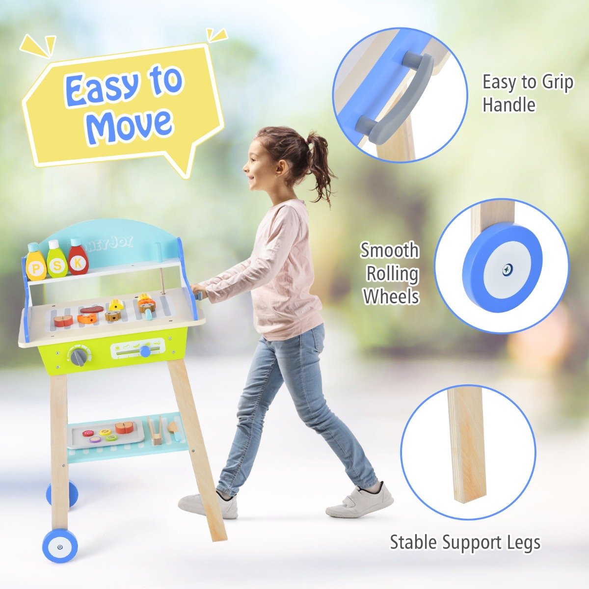 Kid's Pretend Barbecue Grill Play Set with Play Food, Push Handle and Wheels