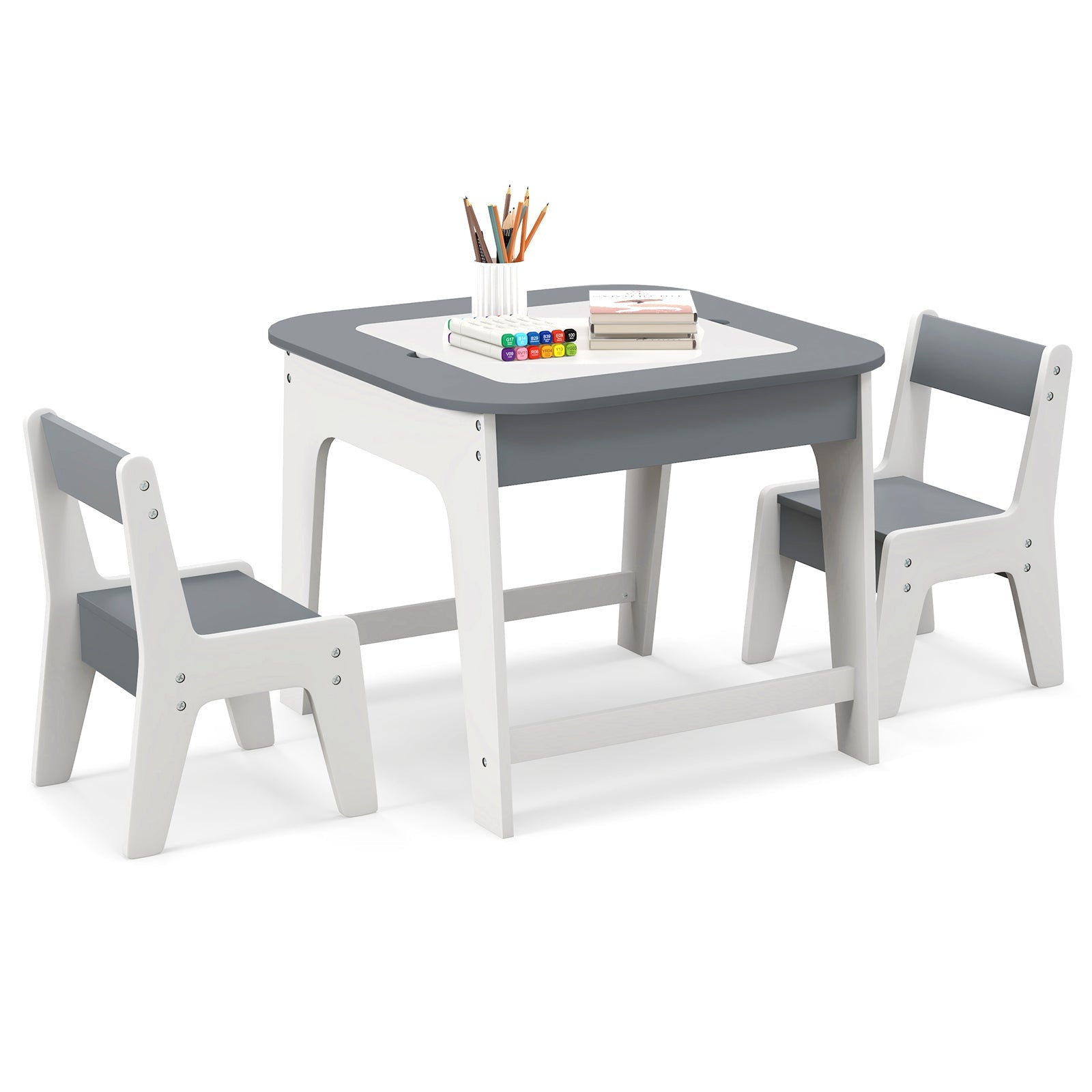 Kid's Table and Chairs Set with Double-sized Tabletop-Gray