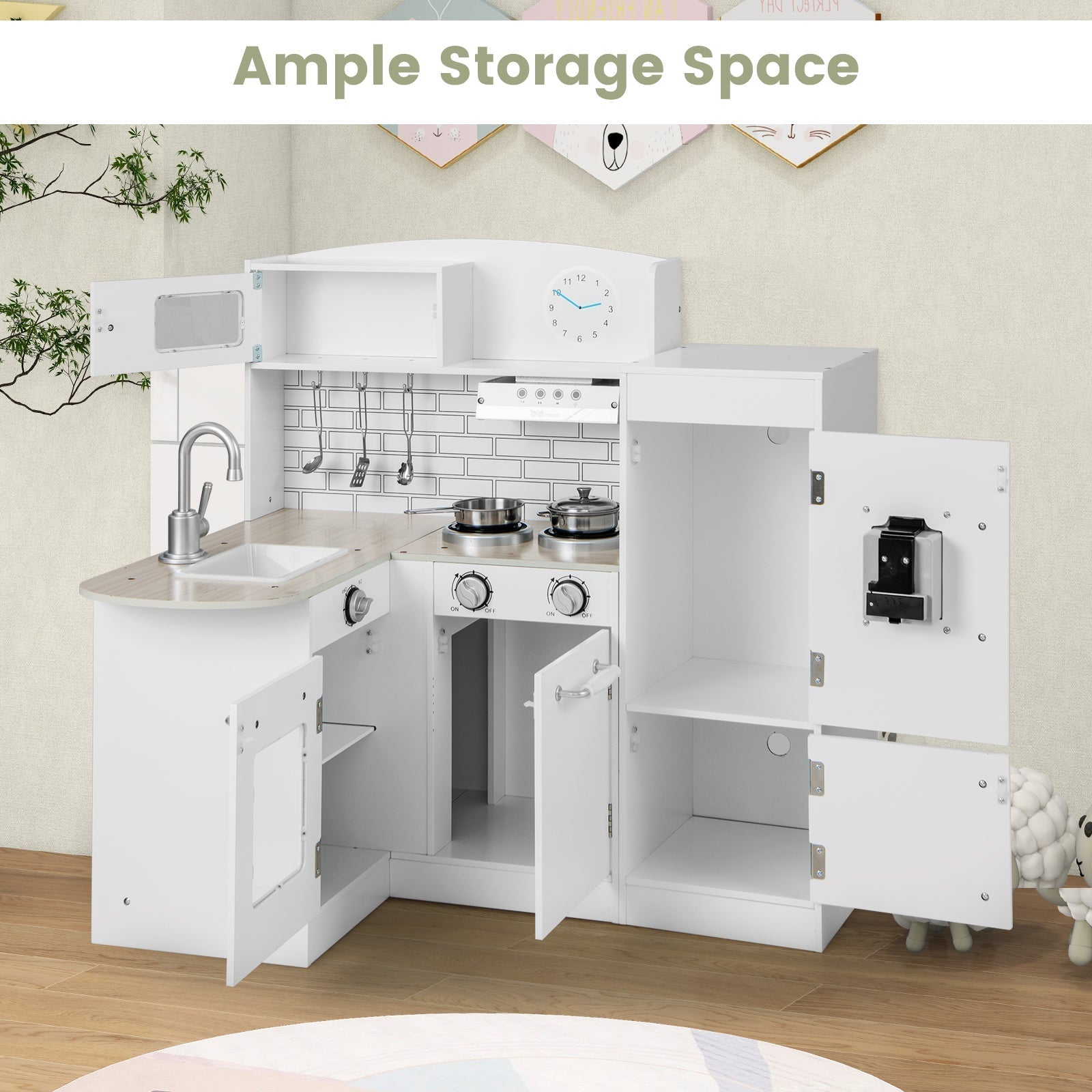 Kid's Wooden Corner Play Kitchen with Ample Accessories-White