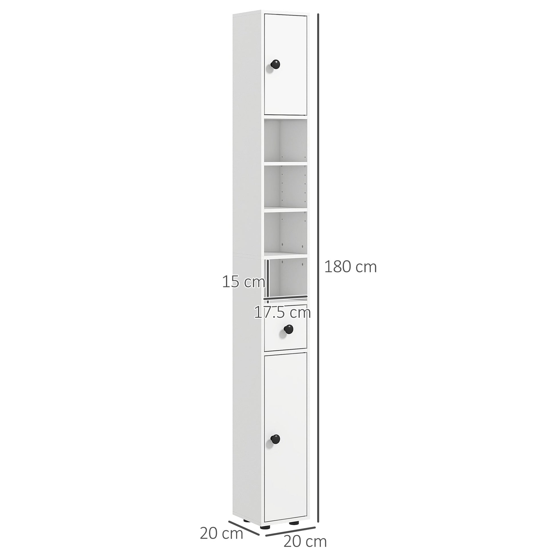 Small bathrooms are always in need of efficient storage. With this kleankin cabinet, you get exactly that. The 180 x 20 cm size makes it a tall, narrow piece; featuring a top and bottom cupboard, drawer and four open shelves, it provides plenty of storage for bathroom essentials. The particle board structure is solid, with a mealine coating for light protection against everyday wear. The clean white design gives it a modern, versatile look.