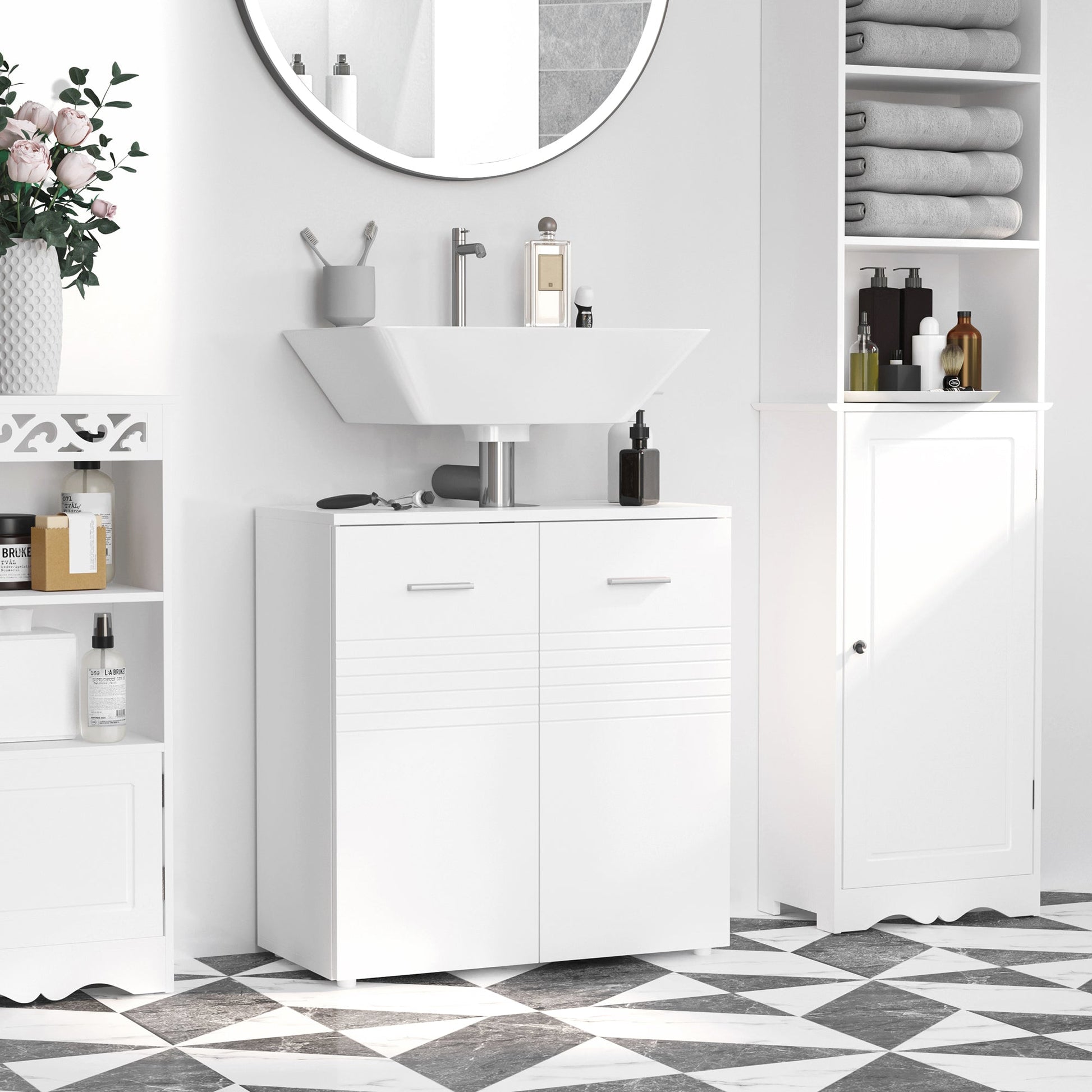 Clean, simple style. Handy space-saving storage. This under-sink cabinet from kleankin is a great addition for your bathroom this season. A classic boxy shape, in a clean white colour for versatility, it features line indenting on the front, for a subtle point of difference. Made from particle board for a durable structure, it features an adjustable shelf, creating two storage compartments - perfect for storing towels, toiletries and more. Complete with door handles.