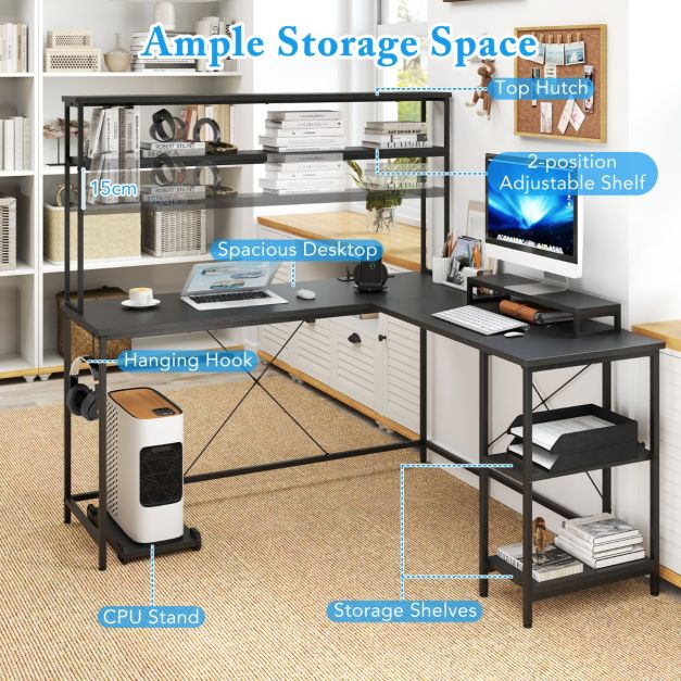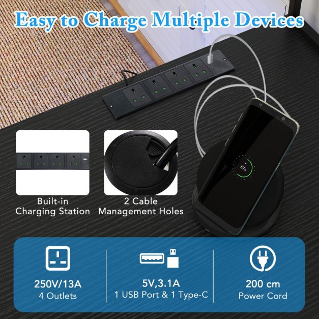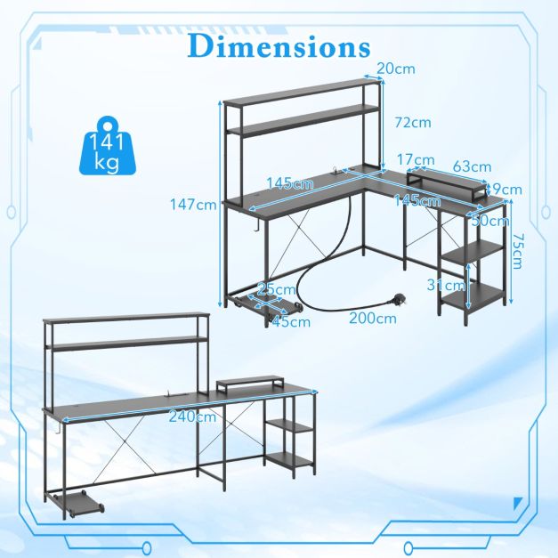L-Shaped Gaming Desk with LED Strip and Power Outlets-Black