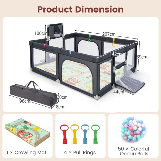 Colour:Light Gray, Dark Gray Material: Oxford Fabric, XPE, Metal, PP Overall Dimension(Without Basketball Hoop or Soccer Net): 207 cm x 142 cm x68cm (L x W x H) Size of Each Soccer Net: 44 cm x 44 cm x 34 cm(L x W x H) Height with Basketball Hoop: 100 cm Size of the Baby Mat: 196 cm x 139 cm(L x W) Size of the Carrying Bag: 96 cm x 20 cm x 18 cm(L x W x H) Applicable Age: 0-3 Years Old Net Weight: 9kg Box qty: 1 Package includes: 1 x Baby Playpen 50 x Ocean Balls 4 x Pull Rings 1 x Instruction manual