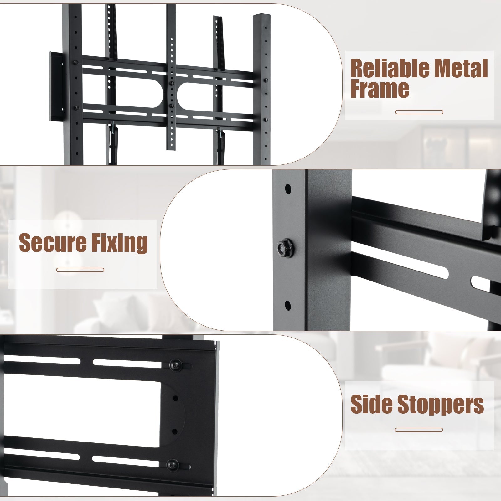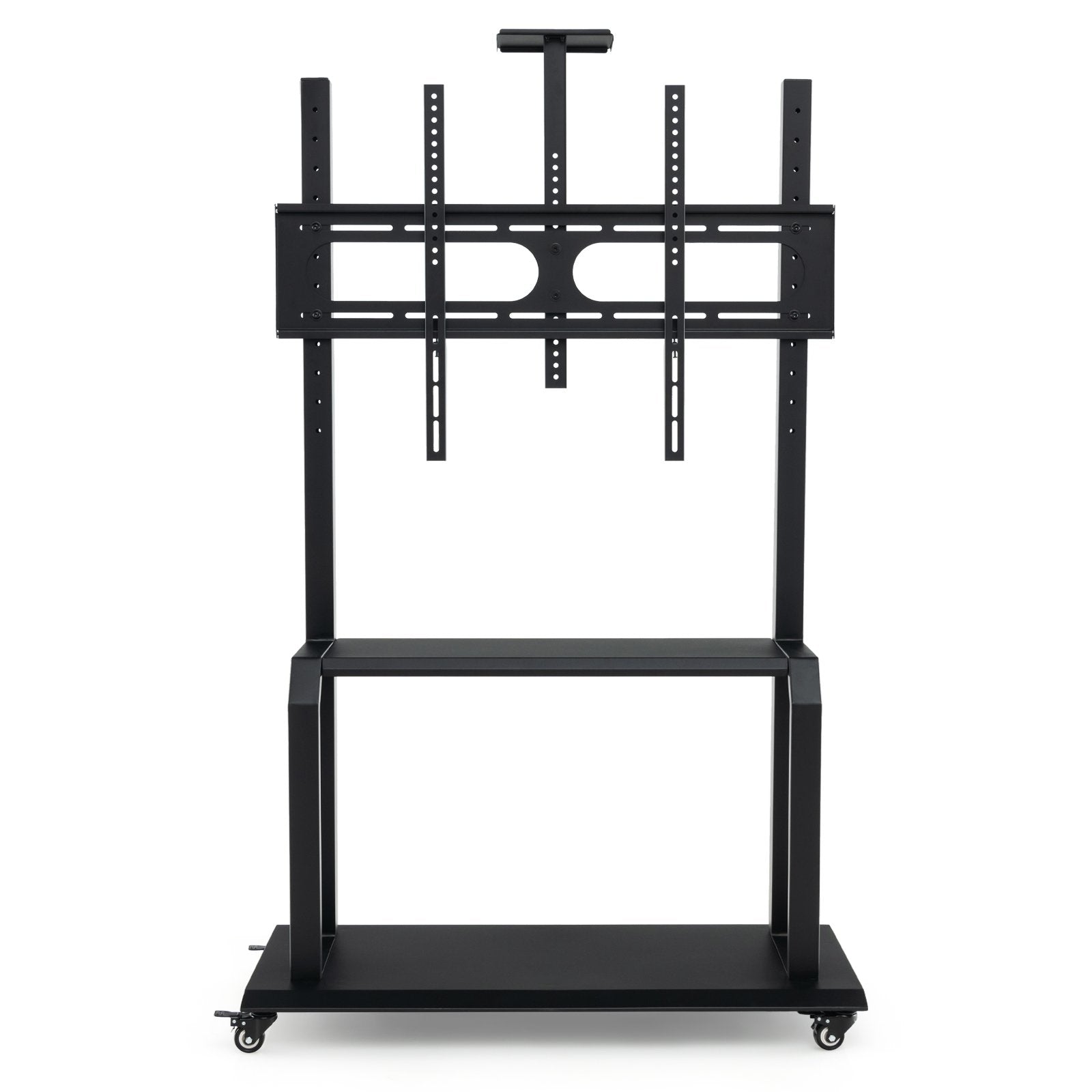 Transform every viewing into a premium event with the mobile TV stand! Adapting perfectly to any 32"-80" TV, this stand is equipped with a flexible bracket to cater to both flat and curved screens. Elevate your viewing experience with 9 different height settings, suited for everyone from the boardroom to the living room. Tired of clutter? The 2-tier AV shelves and an adjustable camera shelf will keep all your tech in check. Glide seamlessly across rooms with smooth, lockable casters - setup is a breeze, wherever you need it. Built to last and styled to impress, this TV cart is your go-to solution for all professional, academic, or cozy movie outings. Don't settle for less, choose flexibility and style. Grab yours now! Adaptable TV Compatibility: Equipped with an adjustable bracket supporting 32"-80" flat/curved TVs, this mobile TV stand is perfect for personal or professional use. The robust mounting system adheres VESA patterns from min 200 x 200 mm to max 900 x 600 mm, with matching screws for a secure fit. Customizable Viewing Height: Tailor your viewing experience with 9-level TV height options. Whether it's for a conference room, exhibition, or living space, you can set the perfect screen height to suit your audience's needs, enhancing comfort and visibility. Enhanced Storage Solutions: This mobile stand doesn't just hold your TV but also offers ample storage options. Featuring a 16-position adjustable camera shelf and a spacious 2-tier AV shelf, it keeps your multimedia devices organized and easily accessible. Smooth Mobility with Lockable Casters: Move your TV setup effortlessly across various floor types with smooth-rolling casters designed to glide without snagging. The lockable feature ensures the cart remains stable during use, providing a safe and secure setup at any location. Sturdy and Secure Construction: Crafted for lasting performance, this entertainment stand combines durability with elegant design. The sturdy metal build handles extensive use while maintaining the modern aesthetics of your space. Ideal for homes, offices, schools, or commercial settings.