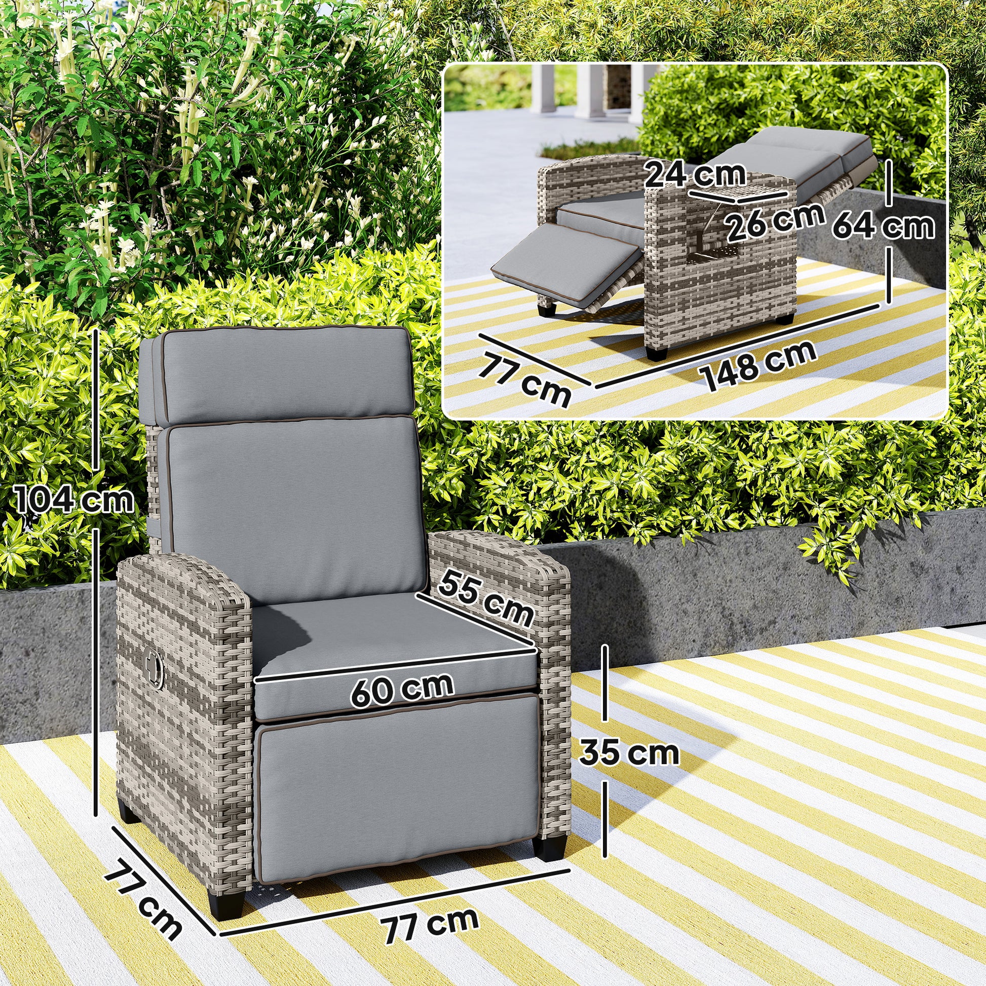 Forever on-trend rattan style, at an angle you want to relax - thanks to this Outsunny rattan recliner chair. The back reclines to a maximum 145° - paired with the manual footrest for full body relaxation. The wide seat is fitted with a padded seat cushion for plenty of comfort. It's complete with a flip-up side tray to keep items right next to you.