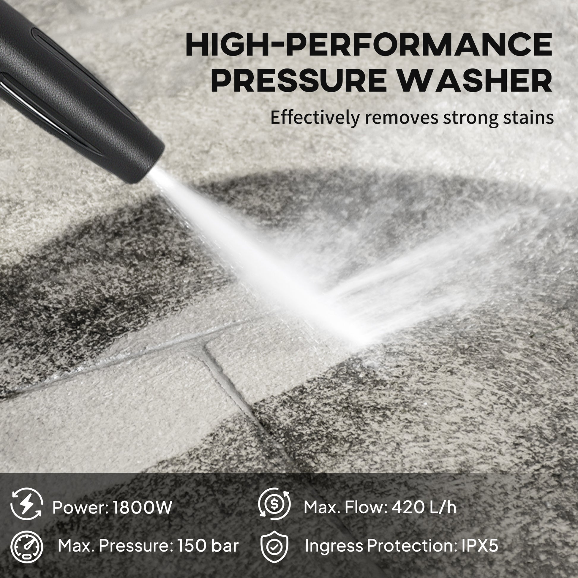 Easy home cleaning of stubborn tasks - this Outsunny portable high pressure washer. The 1800 W motor and 150-bar pressure is powerful - provides 420 litres of water per hour for superb cleaning that deals with a variety of dirt and stains. The spray angle adjusts between 0-75°, making it easy to direct the pressured water to a position you require. With the six-metre long hose, five-metre long power cord and wheels, you can move it around and reach long distances easily.