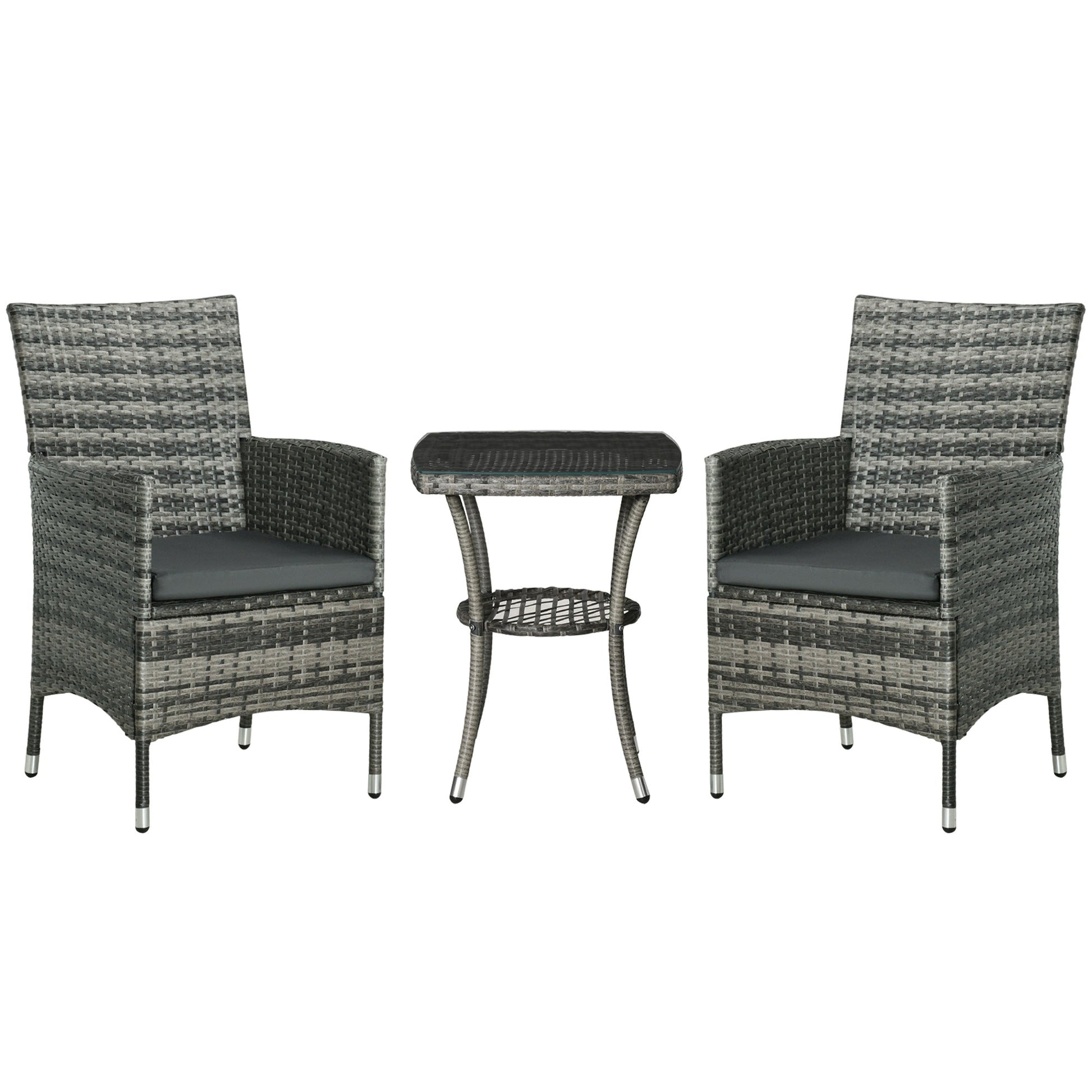 Outsunny 3 Pieces Rattan Bistro Set, Wicker Garden Furniture Set with 2-Tier Coffee Table and Chairs, Washable Cushions, for Outdoor Patio Balcony, Mixed Grey