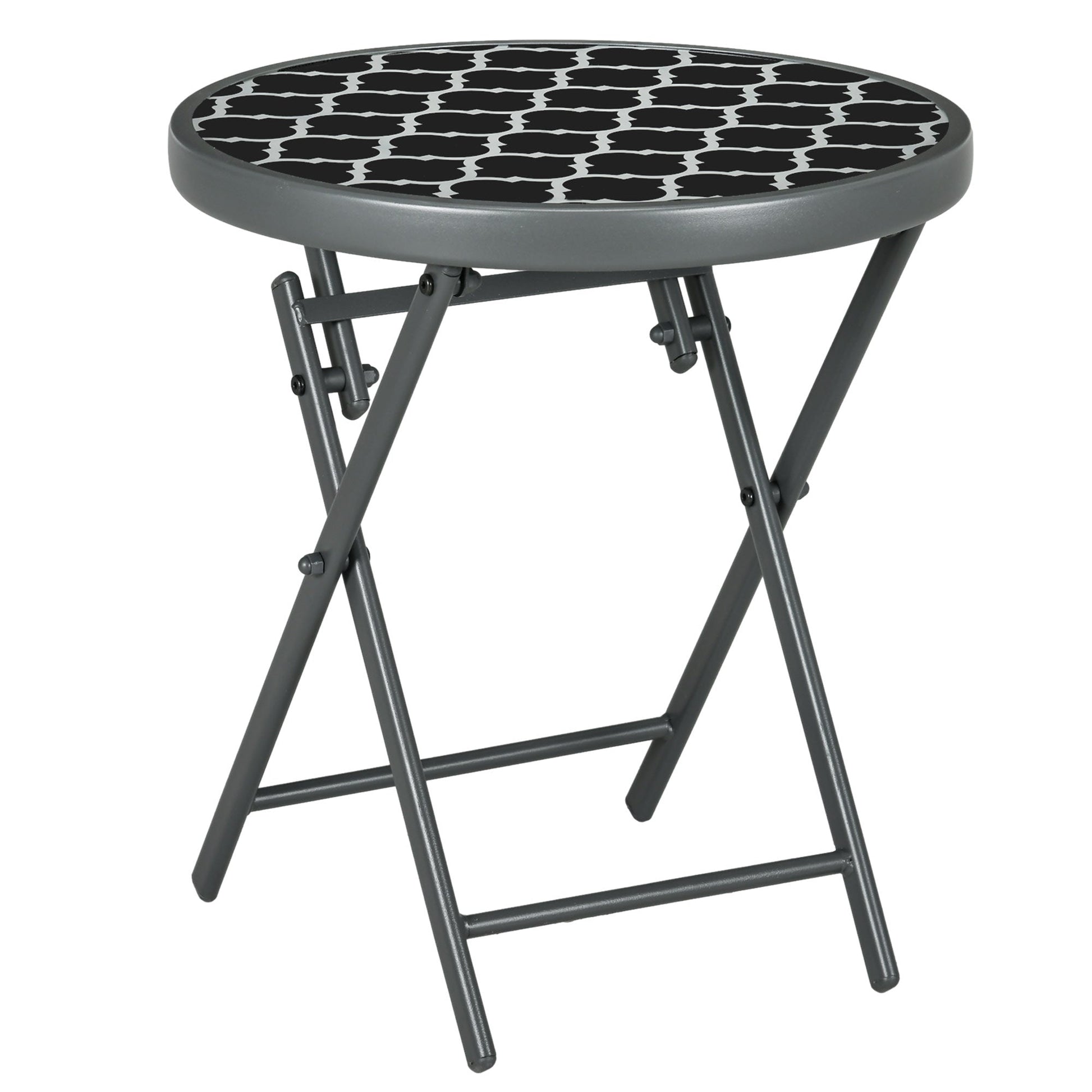 An essential for outdoor spaces. Pair this Outsunny patio side table with your chair: create a spot where you can sit, drink and enjoy the fresh air. A powder coated steel frame for a strong structure; it can be folded so it can be carried around and stored easily. Fitted with a round tabletop, the tempered glass is thick and ensures a safe dining/holding surface. A must for this season and beyond.