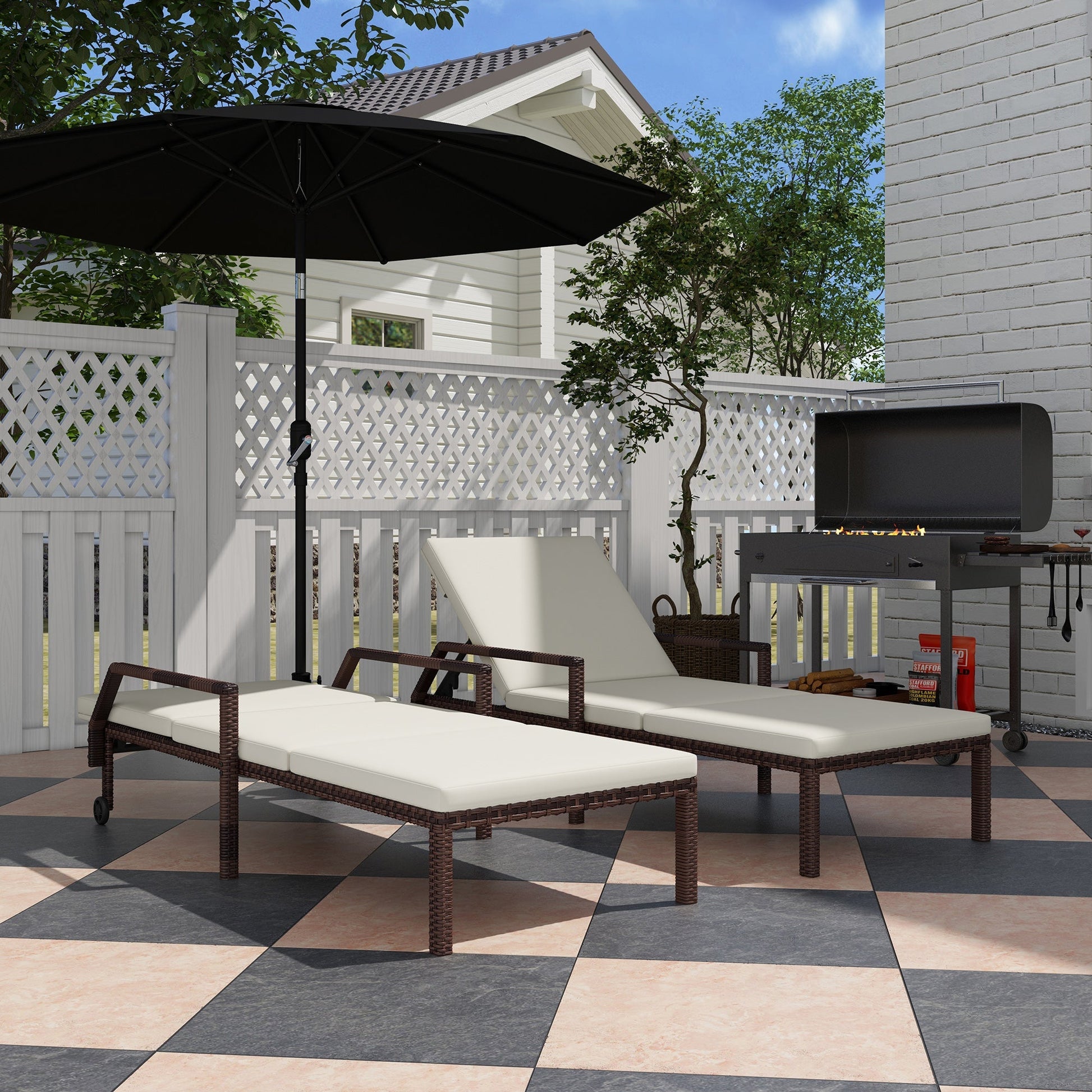 Outsunny Outdoor PE Rattan Sun Lounger Set of 2, Wicker Chaise Recliner Garden Chair with 5-Level Adjustable Backrest and 2 Wheels, Cream White
