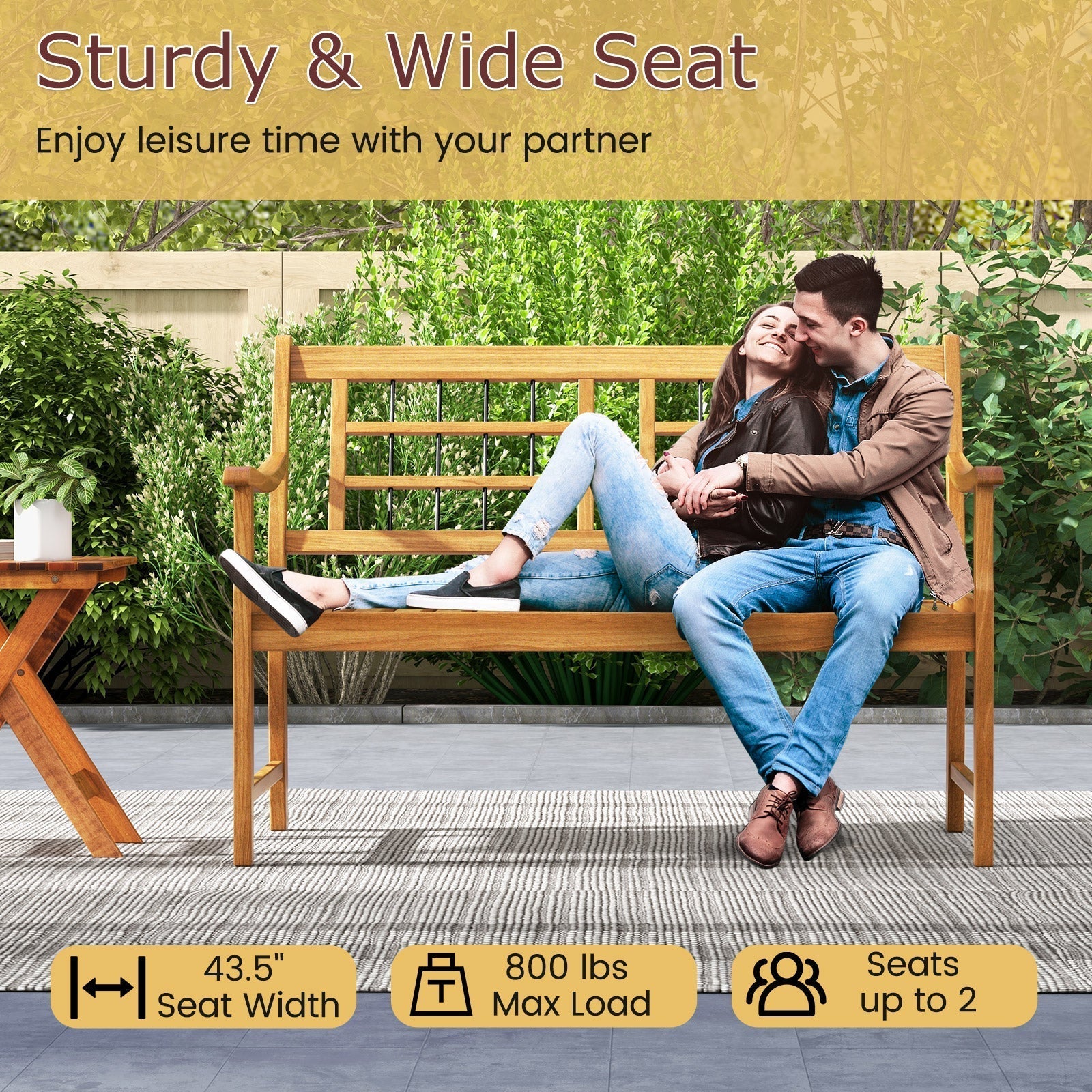 -Made of high-quality acacia wood for extended use-Seats up to 2 with 43.5" spacious seat-Load up to 800 lbs, sturdy and reliable enough-Slatted design makes the seat breathable and not easy to accumulate water-Curved armrests and backrest for optimal comfort-Looks elegant with natural wood appearance-Suitable for backyard, poolside, garden and so on