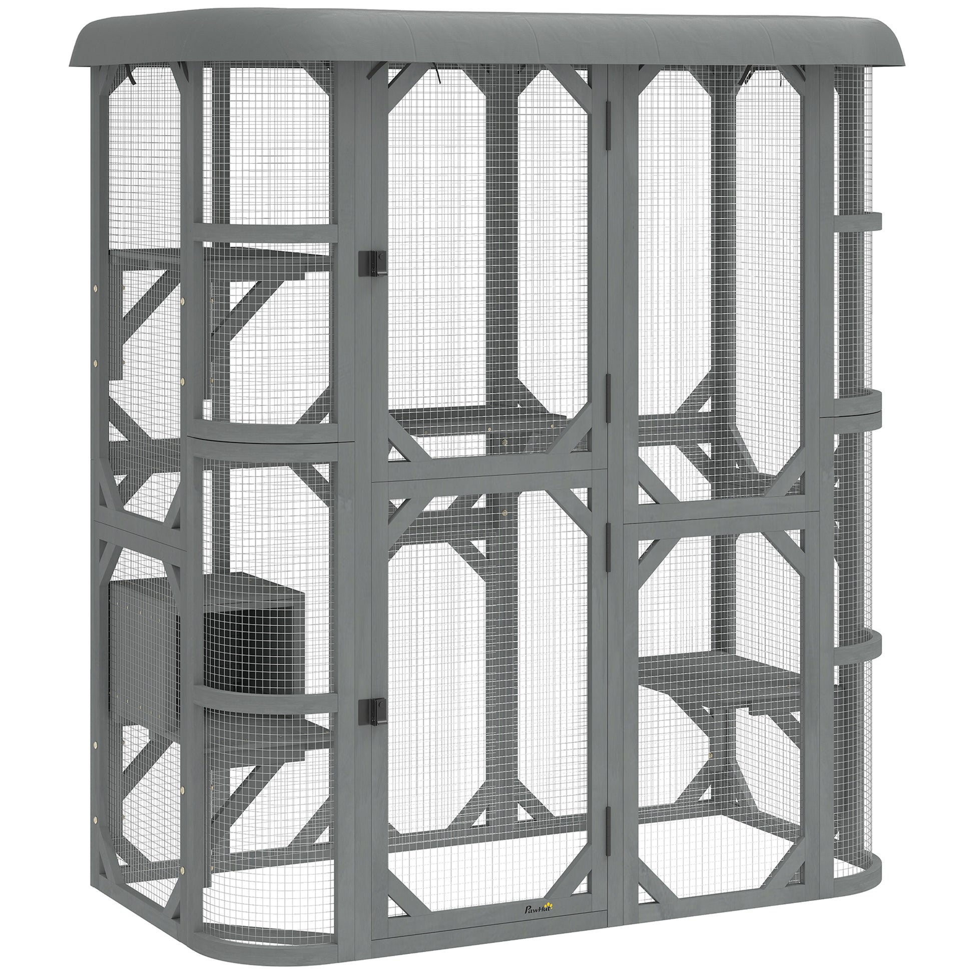 PawHut Catio Outdoor Cat Enclosure, Wooden Cat House with Platforms, Condo and Waterproof Cover for 2“3 Kittens, Grey