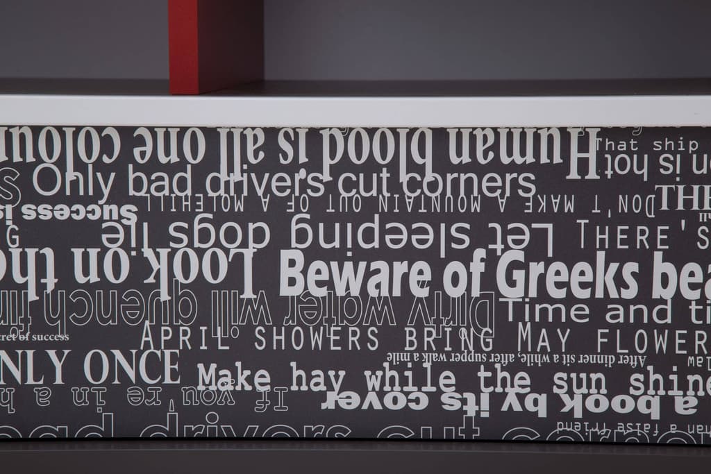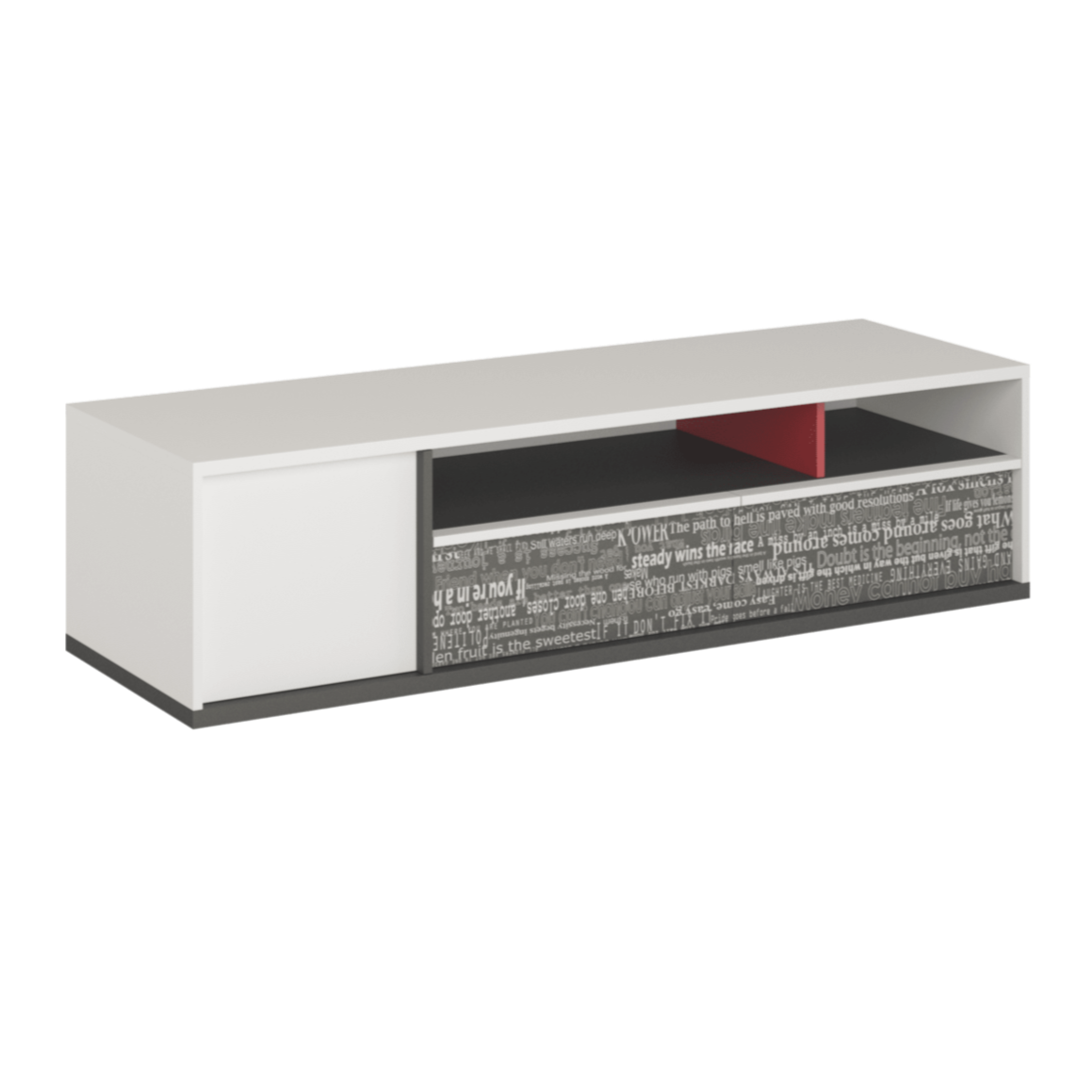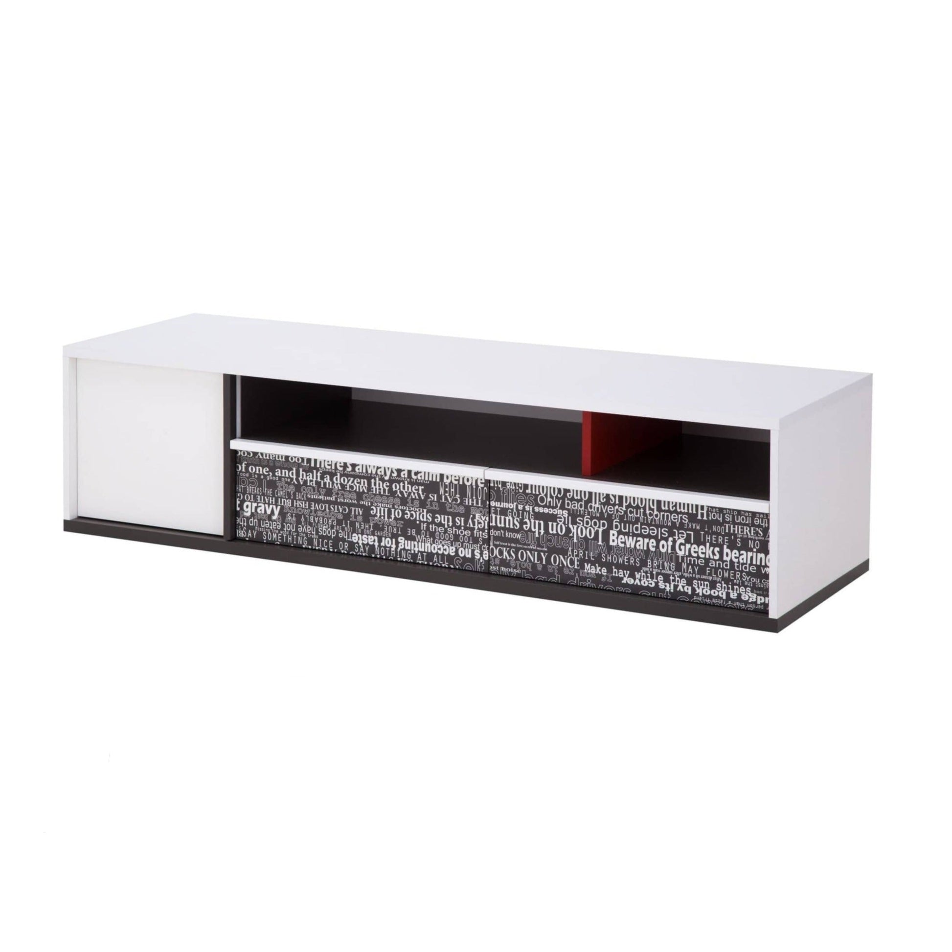 Stylish TV cabinet in white, grey and red a bold and functional unit with drawers, shelves and cupboard for versatile media storage.