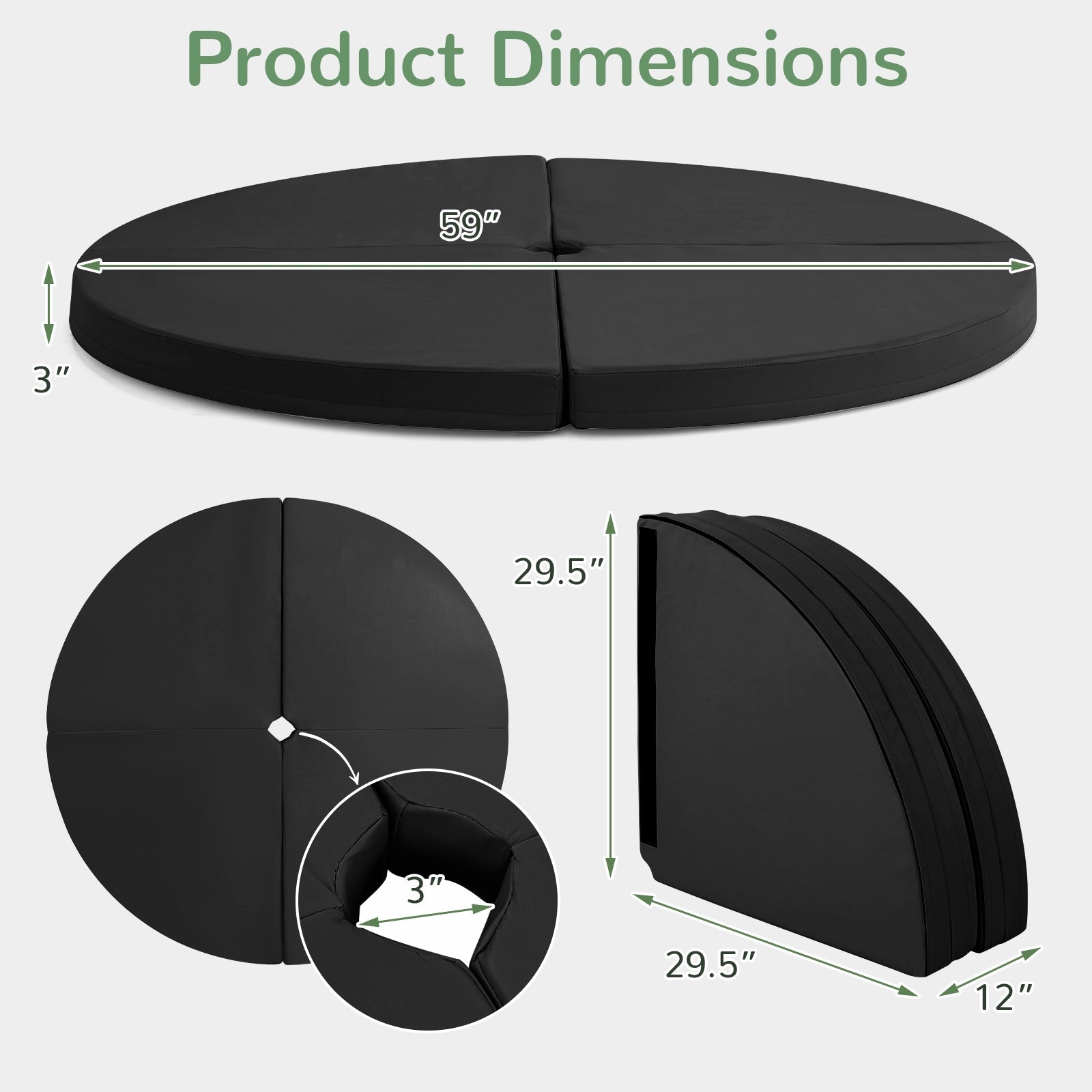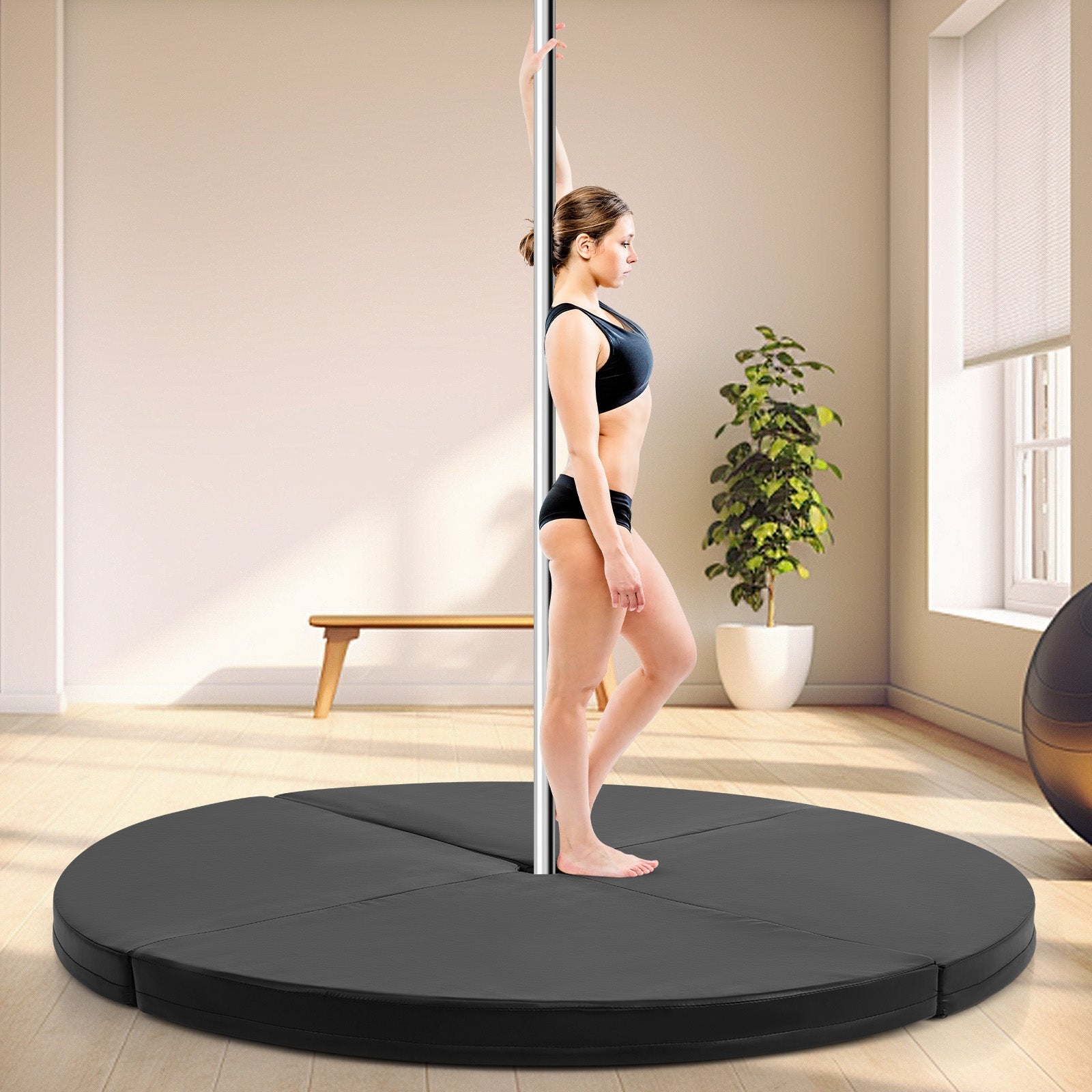 Color Black Material PU+ EPE Foam Overall Dimensions 59" x 3"(Dia x T) Folding Dimensions 29.5" x 29.5" x 8.5"(L x W x H) Net Weight 9.5 lbs Box QTY 1 Package Includes 1 x Pole Dance Mat