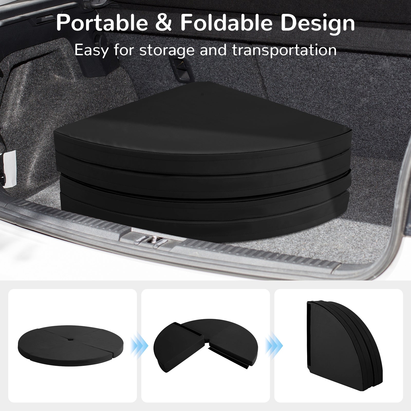 -Folds compactly for easy storage and portability-High-density EPE foam padding for shock absorption-Waterproof PU leather cover for easy cleaning-Suitable for pole dance, yoga, tumbling, and stretching-Versatile use at home, gym, or on stage-Hook and loop fasteners for secure folding-Convenient zipper for quick access to inner mat-Tight stitching design for enhanced durability-Dimensions: 59" diameter x 3" thick for most pole bases