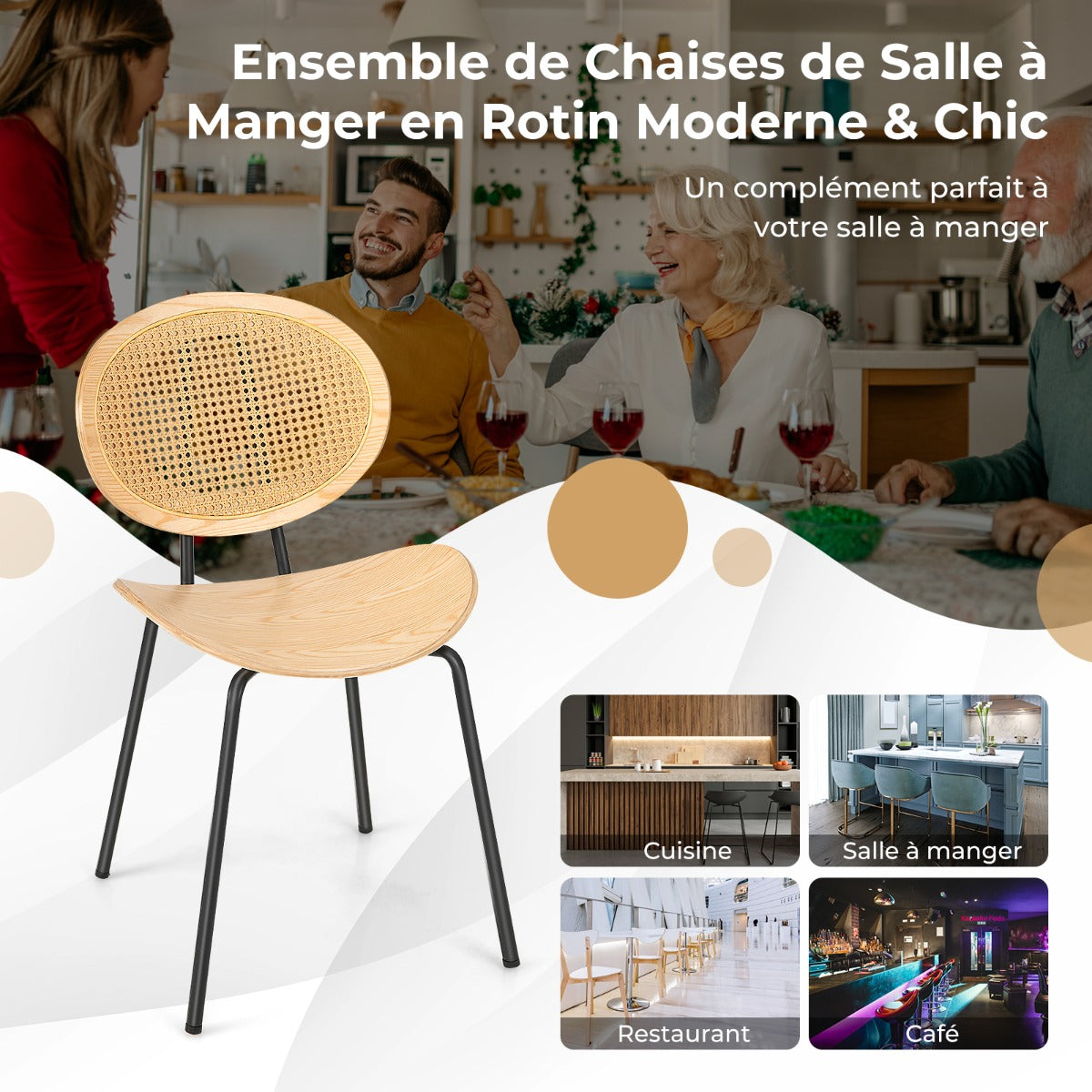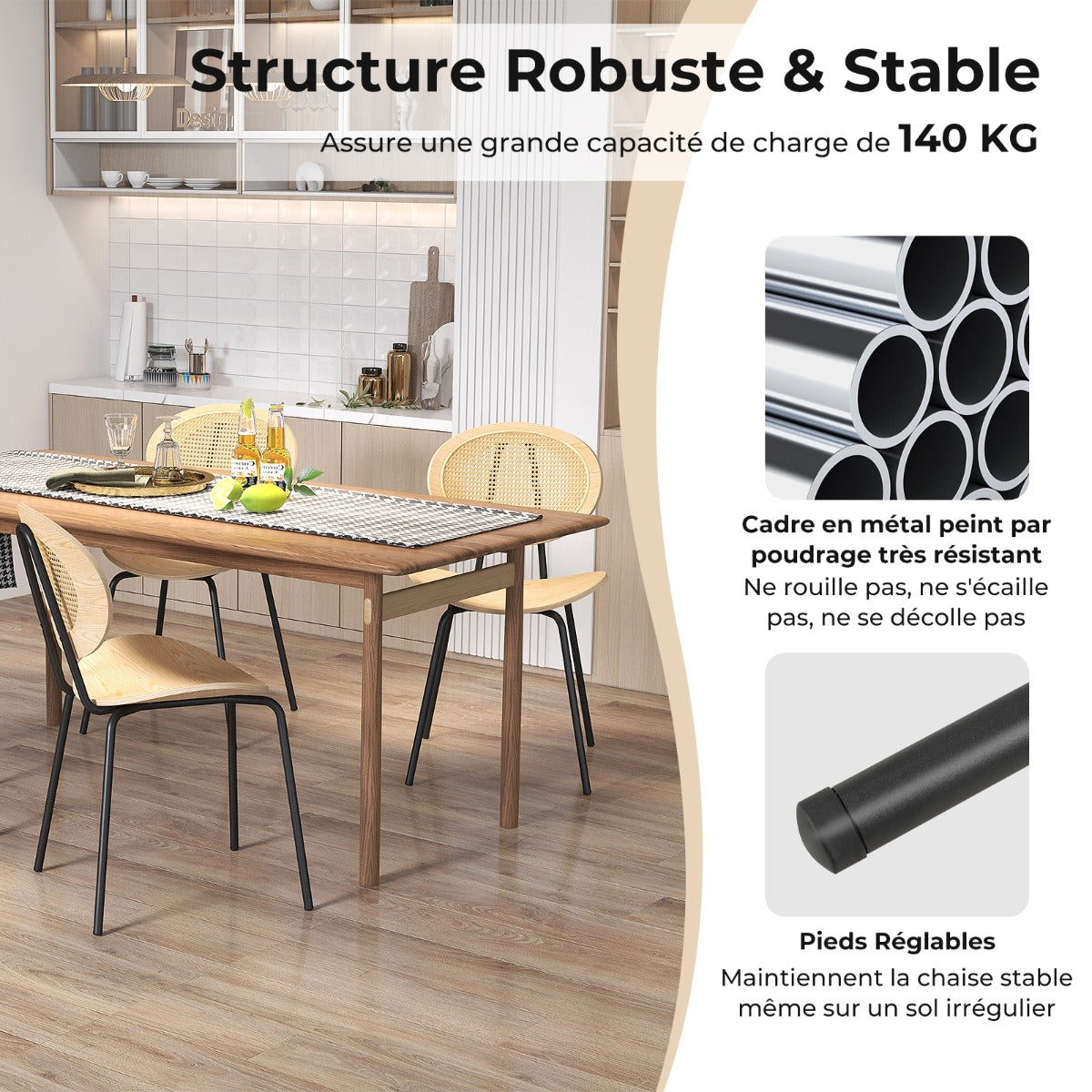 Elevate Your Dining Experience with This Rattan Dining Chairs! The round rattan dining chair measures 47 x 47 x 83 cm/18.5" x 18.5" x 33" (L x W x H) and the seat measures 50,5 x 40,5 cm/20" x 16" (L x W). Designed for ultimate comfort, this chair is designed with a hand-woven rattan backrest and a smooth plywood seat, which provide excellent support while ensuring good ventilation. More than that, the curved backrest and seat follow the natural contours of your body, offering comfy support and promoting a healthy sitting posture. Built to last, these chairs boast sturdy metal frames, which provide exceptional durability, ensuring the chairs withstand daily use for years to come. With their sleek design, these chairs seamlessly blend into any setting, making them perfect for various occasions, such as dining rooms, kitchens, terraces, offices, restaurants, and more. Comfy Sitting Experience: The rattan dining chair is designed with a hand-woven rattan backrest, which maintains a cool and breathable sitting experience. And it adopts a smooth plywood seat, adding a cozy touch to your dining experience. Ergonomic Design: The armless mesh back cane chair is designed with a smoothly curved backrest and seat, which can perfectly align with the natural curves of your body. This thoughtful design promotes proper posture and reduces back strain, allowing you to sit comfortably for hours. Sturdy and Stable Structure: The rattan dining chair is supported by a high-strength powder-coated metal frame, ensuring good sturdiness and a large loading capacity of 140 kg/300 lbs. Besides, there are adjustable footpads on the bottom, which can help keep the chair stable even on the uneven floor. Versatile Use: The exquisite rattan dining chair set with an elegant and stylish appearance gives off a bohemian feel to decoration your living space. It is suitable for various occasions, such as the dining rooms, kitchens, restaurants, coffee shops, reception, banquets, etc. Easy Assembly: The round armless chair measures 47 x 47 x 83 cm/18.5" x 18.5" x 33" (L x W x H) and the seat height is 45 cm/18". In addition, with its simple structure and clear illustrations in the user's manual, you can easily set it up.