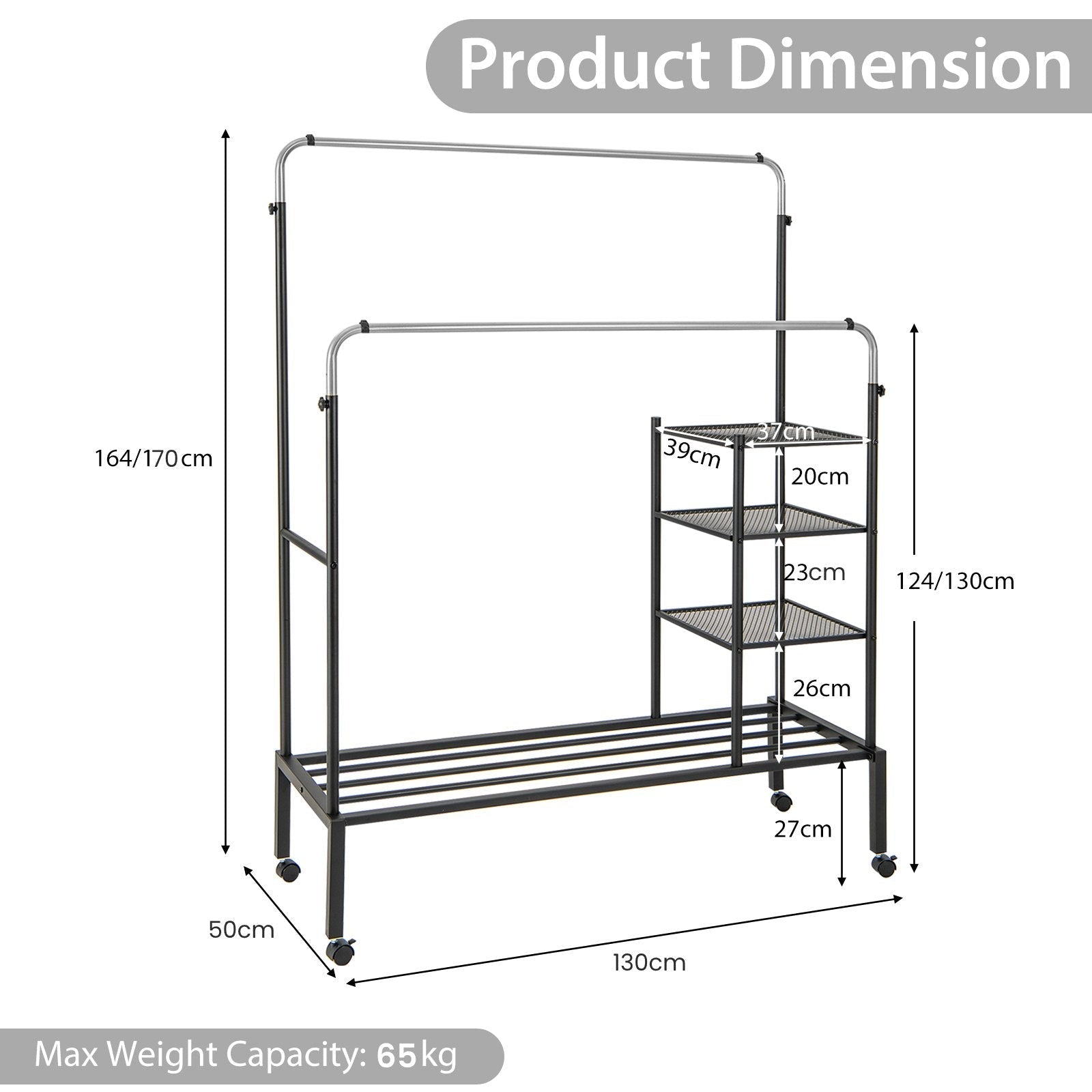 Colour: Black+Gold/Black+Silver Materials: Carbon Steel, PP, Nylon Product Dimension: 130 x 50 x 170 cm (L x W x H) Adjustable Height of Upper Bar: 164/170 cm Adjustable Height of Lower Bar: 124/130 cm Size of Mesh Shelf: 39 x 37 cm (L x W) Net Weight: 11.5 kg Weight Capacity of Each Rod: 10 kg Weight Capacity of Each Mesh Shelf: 5 kg Weight Capacity of Shoe Rack: 30 kg Box Qty:1(May vary by batch)Package Includes: 1 x Clothes Drying Rack 1 x Instruction