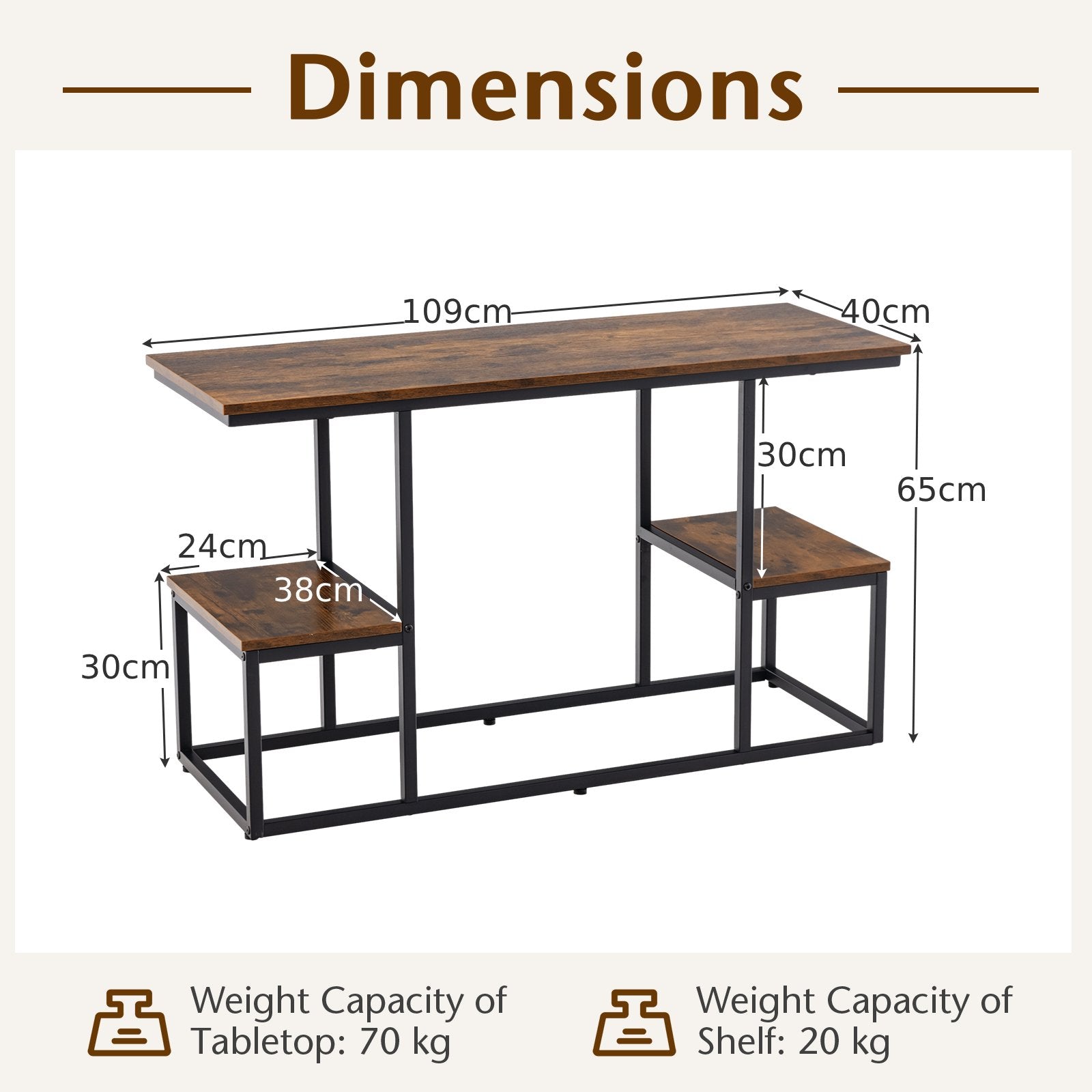 Color: Rustic Brown Material: Engineered Wood, Metal Overall Dimensions: 109 x 40 x 65 cm (L x W x H) Dimensions of Shelf: 38 x 24 x 30 cm (L x W x H) Space Between Tabletop and Shelf: 30 cm Weight Capacity of Tabletop: 70 kg Weight Capacity of Shelf: 20 kg Net Weight: 12 kg Box Qty:1(May vary by batch)Package Includes: 1 x Console Table 1 x Instruction
