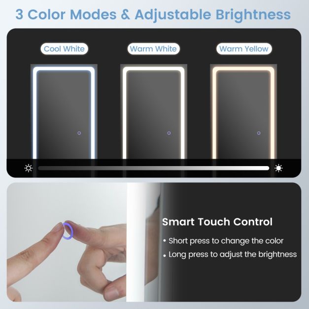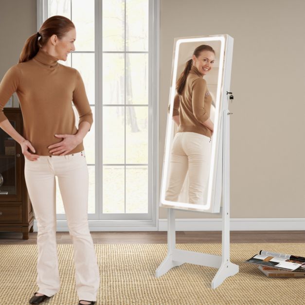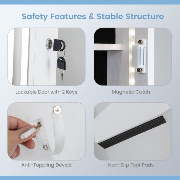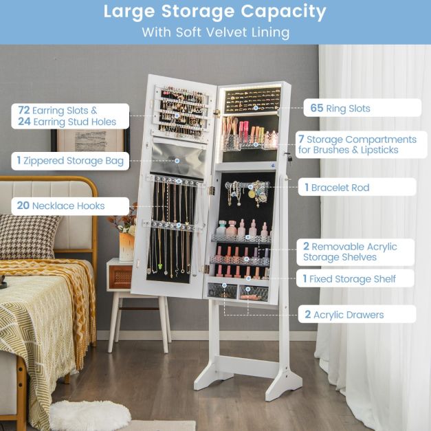 This freestanding mirrored jewelryarmoirewill make your life much easier! Equipped with 72earring slots, 24 earring stud holes, 20 necklace hooks,65ring slots, 1 zippered plastic bag and 1 bracelet rod, this jewelry cabinet can organize all your jewelryproperly. Plus, the lipstick tray, 2shelvesand 2 drawers that are all made from acrylic offer extra storage space for your makeup, skin care products, etc. To keep your belongings well protected, the jewelry armoire adopts a lockable door and soft velvet lining inside. More importantly, the touch screen full-lengthmirror with 3-color LED lighting can bring light to your room, while the built-in 3-color LED lights make it easier for you tochoosethejewelryin the dark. Besides, there are 3holes on each side of the stand, allowing you to adjust the tilt angle of the jewelry cabinet to get a better view. Large Capacity and Classified Storage: This jewelry cabinet comes with 72 earring slots and 24 earring stud holes, 1 zippered storage bag, 20 necklace hooks, 65 ring slots, 1 acrylic cosmetics and lipstick box, 1 bracelet rod, 2 removable acrylic storage shelves, 1 fixed storage shelf and 2 acrylic drawers to keep your jewelry organized and easily accessible. External andInternal LED Lights: The standing jewelry armoire features a lighted external full-screen mirror, which has 3 color temperature options: cool white, warm white, warm yellow. Plus, the built-in dimmable LED strip also has 3 colors of lights for you to choose: blue, blue and white mix, yellow. And you can long press the button to adjust the brightness. Note: please connect the included power adapter before using. Well-made and Thoughtful Design:Equipped with a lockable door with keys, the mirrored jewelrycabinet keeps every piece of your jewelrysafe. Moreover, the back anti-tipping strap, reinforced base and anti-slip foot padsat the bottom ensure high stability and security. 2 in 1 Adjustable Jewelry Cabinet:This multipurpose freestanding jewelry cabinet and full-length mirror can perfectly meet all your dressing and jewelry storage needs. In addition, the jewelry armoire features 3 adjustable tilt angles, allowing you to find the most suitable angle for you. Perfect Gift for Your Beloved One:Combining elegant appearance and large storage capacity, this jewelry organizerarmoire with LED lightsis the ideal gift for your wife, mother or girlfriend.What's more, the cabinet body is pre-assembled for a hassle-free setup.