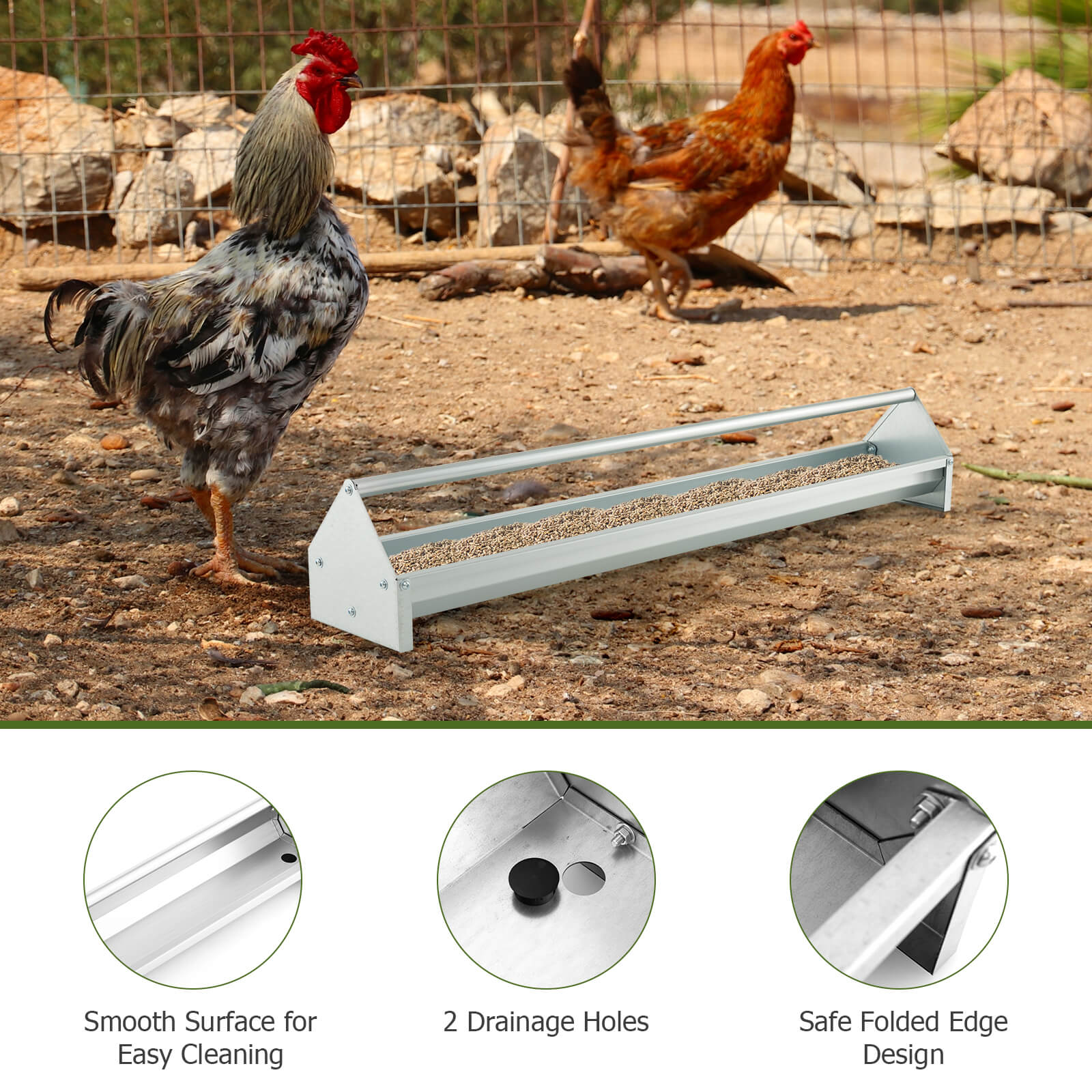 This galvanized steel chicken feeding trough with 115 cm length and 15 L volume, which could feed multiple chickens simultaneously. Crafted with a robust and rustproof galvanized metal frame, this feeder trough is built to withstand the test of time. Moreover, the innovative crossbar design could prevent chickens from stepping on or wasting feed when accessing it from both sides. And it can also be rotated, thus birds could not perch on it. You can also use it as a carrying handle for easy movement. Additionally, equipped with 2 drainage holes, this feeder trough can be conveniently rinsed clean. Not only is this feeder trough suitable for chickens, but it is also a versatile choice for other domestic fowl such as ducks, geese, and pigeons. It effectively minimizes feed wastage and guarantees the efficient distribution of food to your entire flock. If you are looking for such a product, do not hesitate to buy it! Large Capacity: This 115 cm long chicken feeder trough features 15 L volume, providing ample food for your poultry with ease. And it could feed up to 12 chickens at the same time. Say goodbye to constant refilling and save time and effort. Durable and Sturdy Material: The chicken feeding trough is constructed of a heavy-duty galvanized metal frame, which is built to withstand the demands of long-term use. And it is also characterized by excellent rust resistance, ensuring outdoor use. Unique Crossbar Design: The heavy-duty metal chicken feeder trough is equipped with a unique crossbar, which could effectively avoid stepping on the trough while providing double-side feeding. And the rotatable design can prevent birds from resting on the crossbar, keeping food clean. Easy to Carry and Clean: The poultry feeder trough only weighs 5 kg and there exists a multifunctional crossbar, making it easy to pick up anywhere you want. Additionally, thanks to its smooth surface and 2 drainage holes with caps, you can flush it with water for easy cleaning. Wide Application: This large-capacity chicken feeder is designed to reduce waste and keep a clean and hygienic environment. Moreover, it is suitable for a variety of poultry, such as chicken, ducks, geese, pigeons, and more.