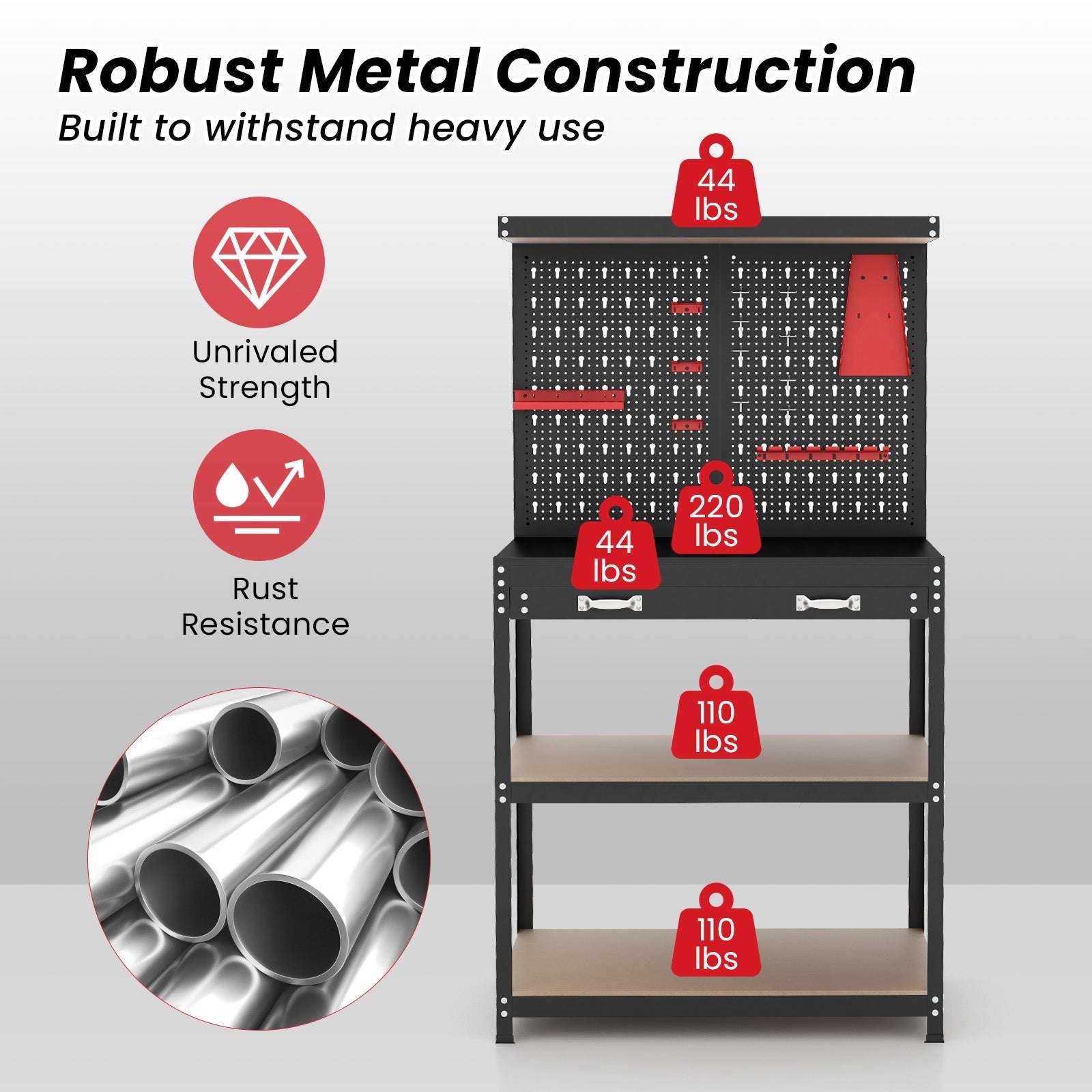 Tool Storage Workbench with Pegboard Shelves and Drawers-Red