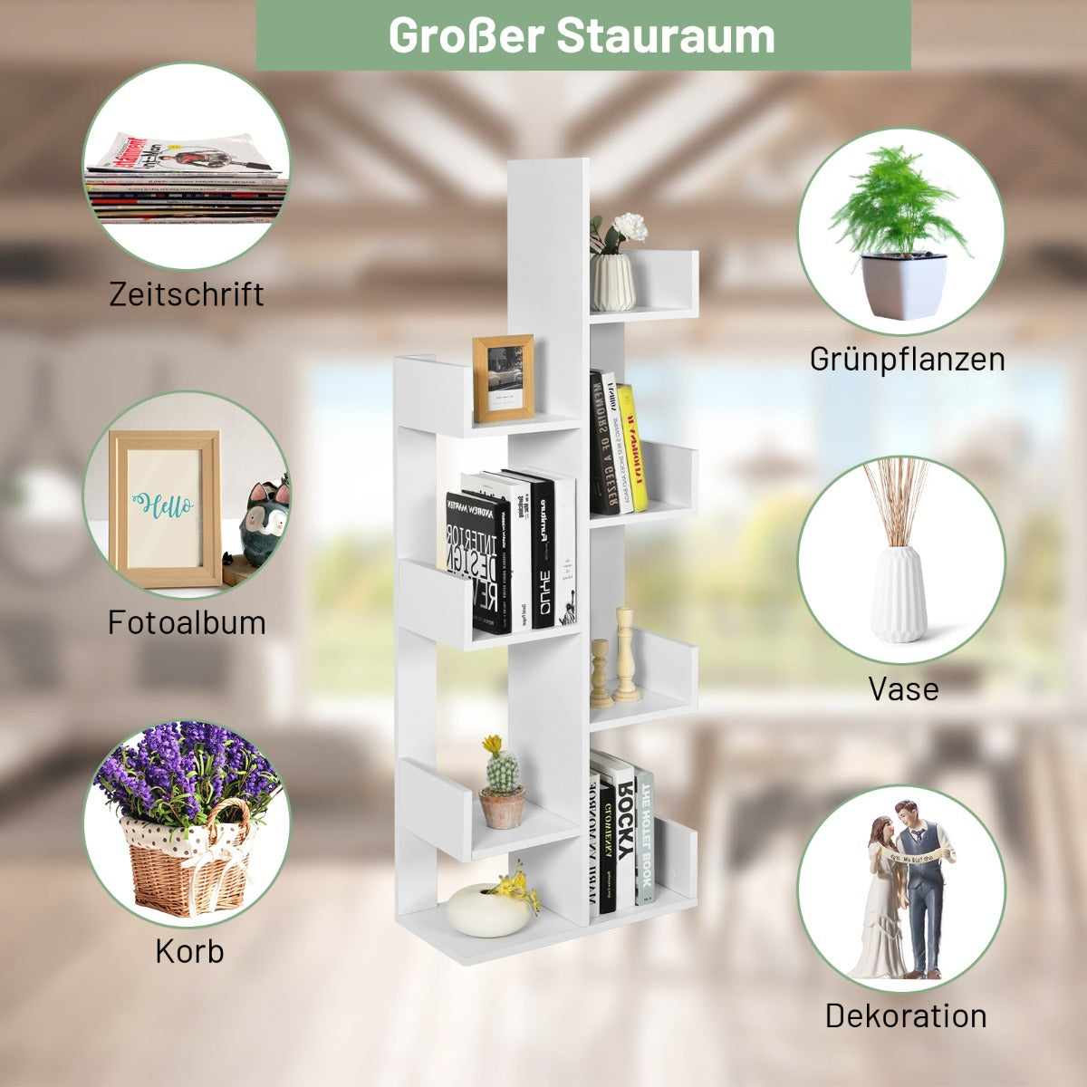 Tree-shaped bookcase with 8 compartments, standing shelf, storage shelf, 50 x 25 x 145 cm, white