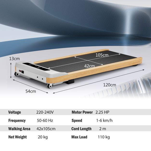Color: Gray + Black + Natural Material: Metal, Rubber Wood, ABS, PVC, MDF Overall Dimension: 120 x 54 x 13 cm (L x W x H) Size of Running Belt: 105 x 42 cm (L x W) Length of Power Cord: 2 m Net Weight: 20 kg Weight Capacity: 110 kg Motor Power: 2.25HP Voltage: 220-240 V/50-60Hz AMP: 8A Speed Range: 1-6KPH Package Includes: 1 x Walking Pad 1 x Remote Control 1 x Silicone Treadmill Lubricant 1 x Instruction