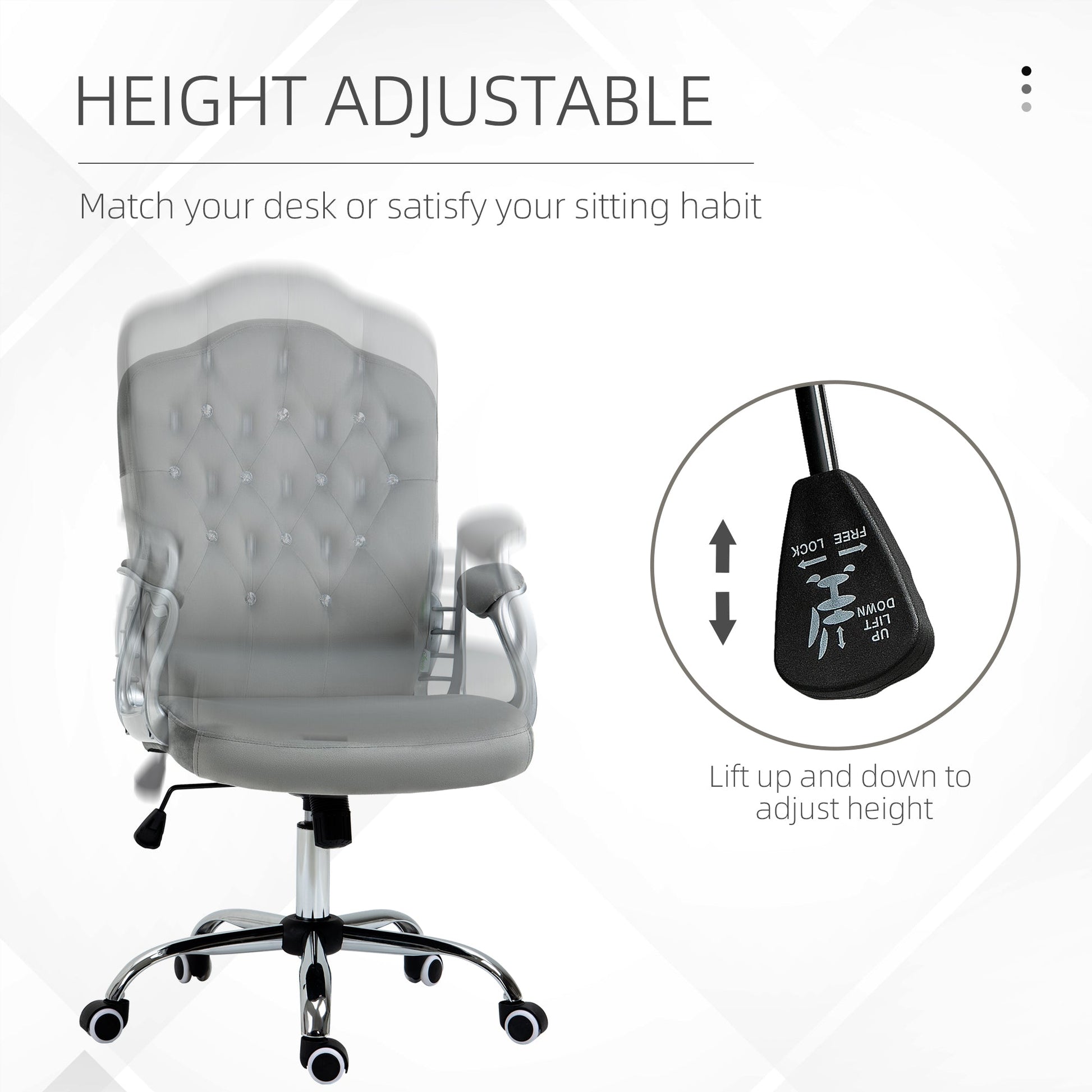 Inject a touch of glam and sophistication into your work day with this Vinsetto computer chair. Comfortable features include the thick padding, the adjustable tension back and armrests. Wrapped in velvet-feel upholstery, the back is scattered with an abundance of diamantes for top glamour. Completed with five wheels for easy movement. This comfortable office chair is a sparkling addition to your home office.