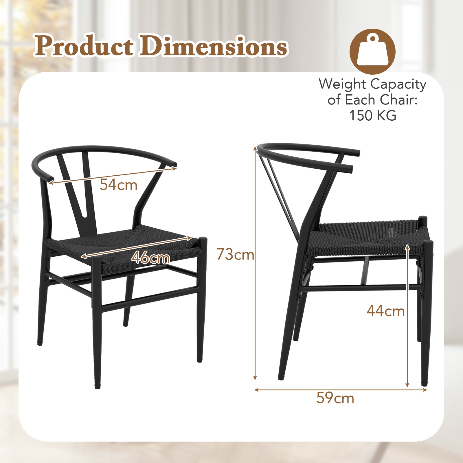 Colour: Black+Natural/Black/Natural Material: Metal, Kraft Paper Twine Product Dimensions: 46 x 59 x 73 cm (L x W x H) Seat Size: 46 x 40 cm (L x W) Seat Height: 44 cm Weight Capacity of Each Chair: 150 kg Net Weight of 2 Chairs: 12.5 kg Net Weight of 4 Chairs: 25 kg Box QTY: 1 Package Includes: 2/4 x Dining Chairs 1 x User’s Manual