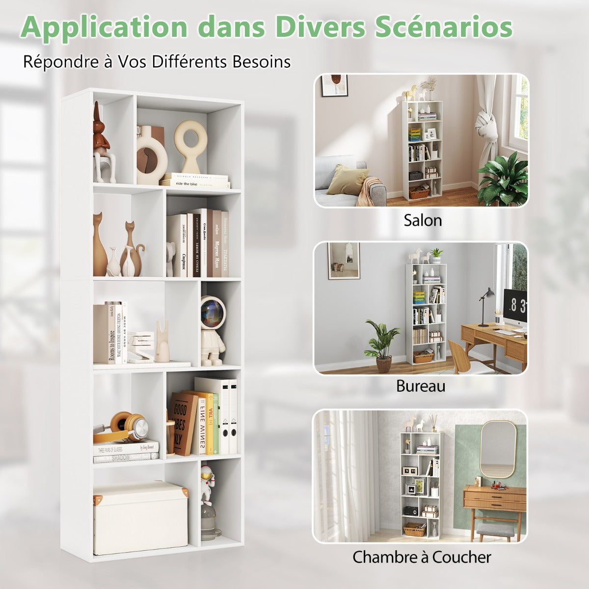 The five-tier structure and 10 open storage compartments provide plenty of space for your everyday items and allow you to display favorite collections or decorative items. Quality engineered wood and strong connections provide excellent load-bearing capacity. What's more, the reliable anti-toppling device can also protect the storage rack from tipping over. You can use this bookshelf in different places, such as office, living room or study. Modern Appearance and Multi-functional Bookshelf:This five-level bookshelf has a very modern geometric appearance and elegant color. It can be used not only as a bookshelf in the study, but also as a storage rack or display shelf in the living room or bedroom. The minimalist design suits most decorating styles, and it will add flair to your room no matter where you put it. Compartmentalized Design and Large Storage Space: This functional bookshelf has a five-level structure and 10 storage compartments of different sizes. It not only provides you with plenty of storage space, but also allows you to sort your items for easy access. It can accommodate your daily necessities, including decorations, books, magazines, potted plants, photo frames. Premium Material and Strong Connection: Made of high quality engineered wood, our bookshelf has great strength. The stable structure provides a total weight-bearing capacity of up to 90kg. In addition, the safe paint layer makes the surface of the shelf smooth and waterproof, which can be easily cleaned by wet towels. Anti-toppling Device: For families with children or pets, it is crucial to purchase a piece of furniture with an anti-toppling device. The anti-tip device on the back of this bookshelf allows you to fix our products to the wall, which can prevent the shelf from collapsing due to collisions, thus ensuring the safety of you and your family. Quick Assembly and Detailed Instruction: The 5-tier storage shelf is easy to assemble. The instructions describe the installation process in detail and all the necessary accessories for the product are included. Just follow the instructions and you will get a wonderful coffee table without spending much time and effort.