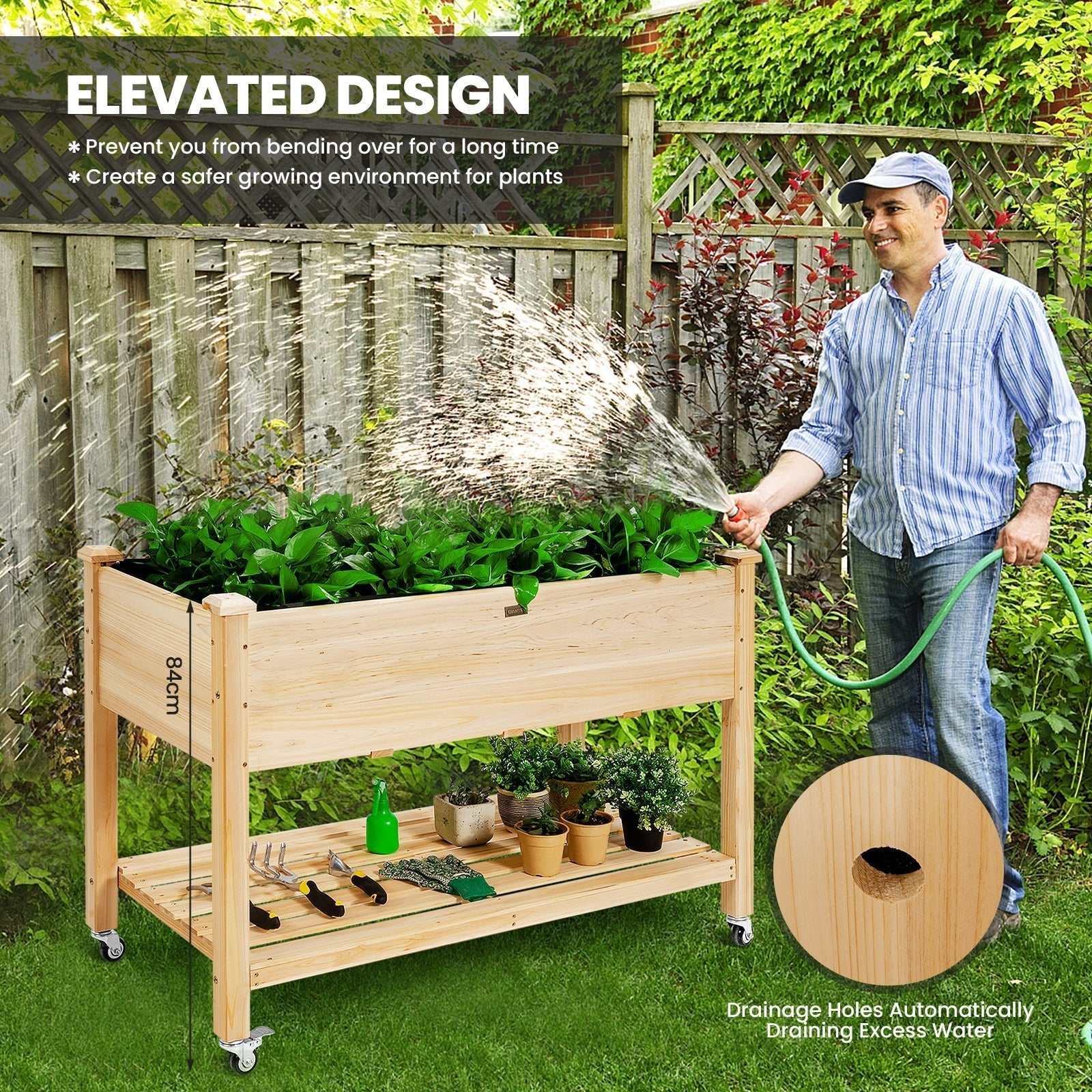 Wood Elevated Planter Bed with Lockable Wheels Shelf and Liner