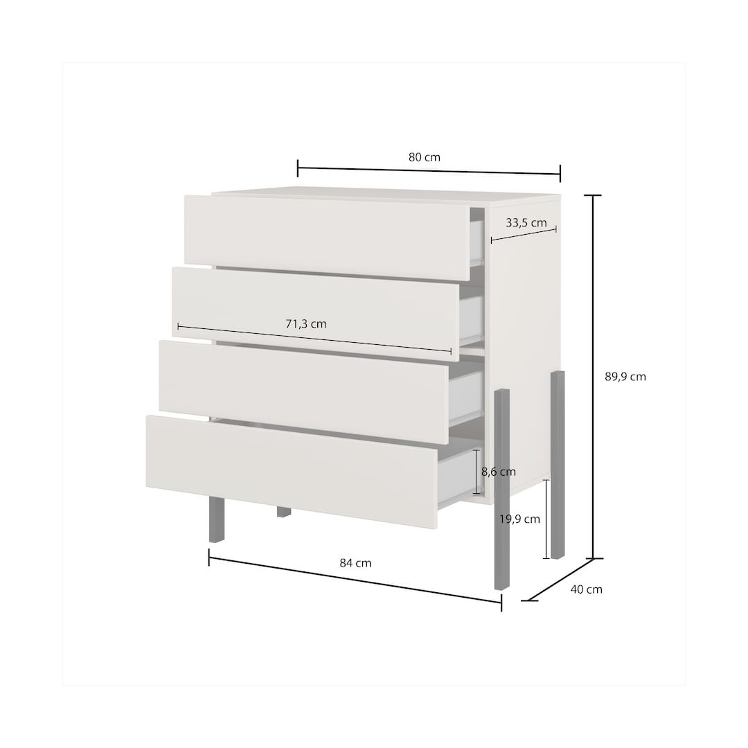 The Yukon Chest of Drawers 80cm combines sleek design with practical storage. Featuring four smooth-glide drawers with a push-to-open system and sturdy black metal legs, it keeps clothing and personal items organised while maintaining a clean, contemporary look. Crafted from 16mm high-quality laminated board with ABS edging, this handless chest complements modern UK bedrooms and living areas. Its compact dimensions make it a versatile and stylish solution for smaller spaces without compromising on functionality.