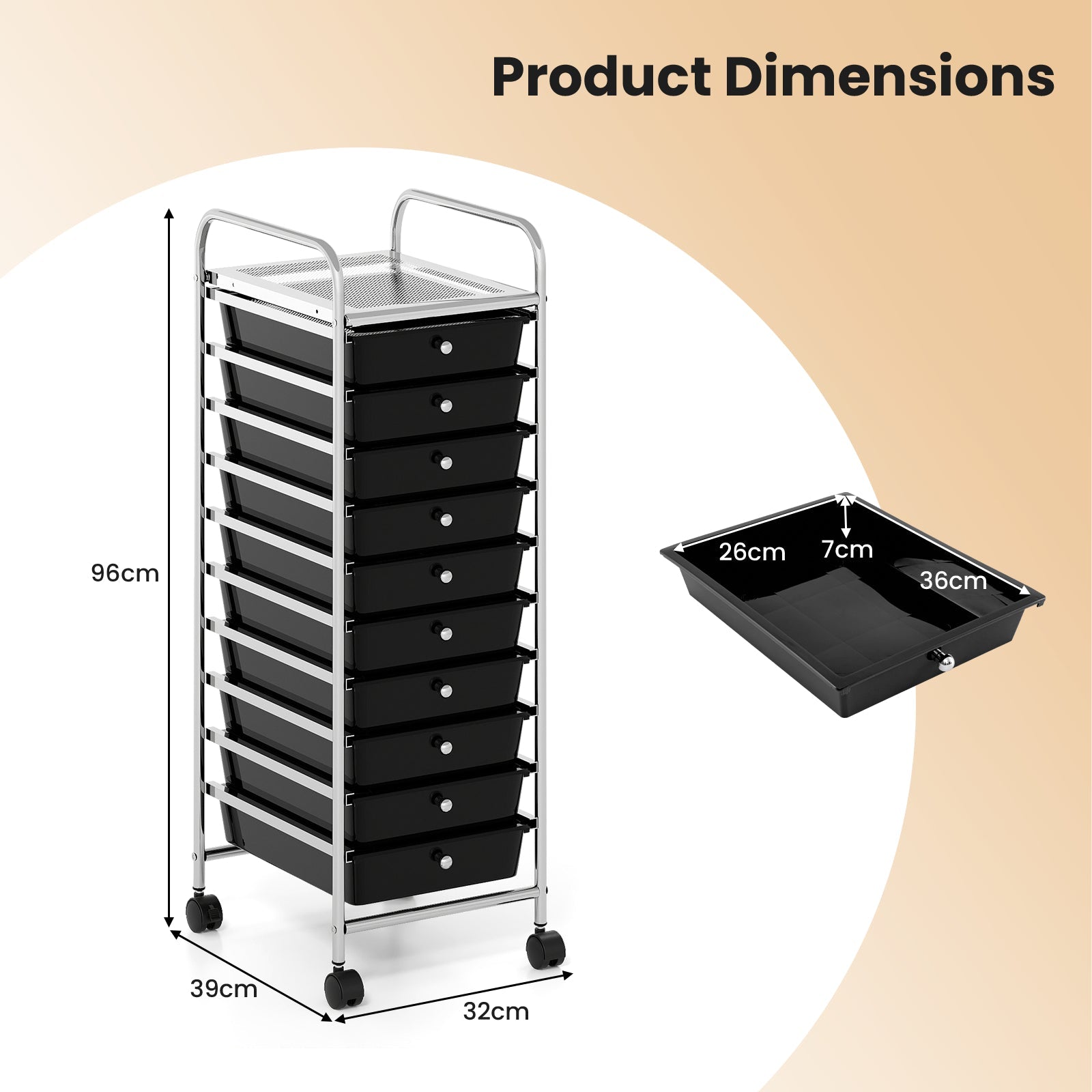 This 10-drawer rolling storage cart with lockable wheels and removable drawers-black is designed to keep your space organised while delivering reliable everyday functionality and a clean, modern look.