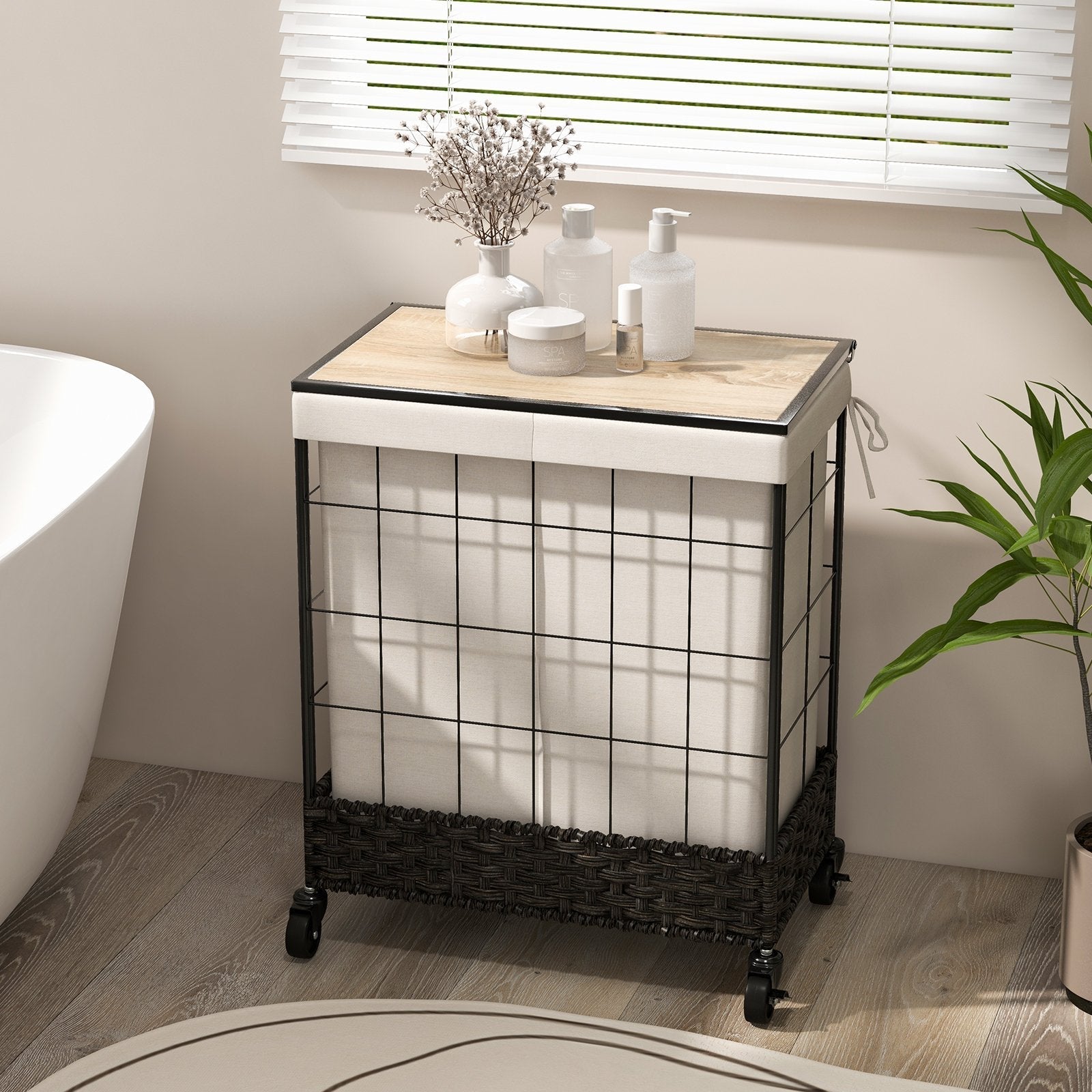 130L Handwoven Rattan Laundry Hamper with Lid and Lockable Wheels-Black