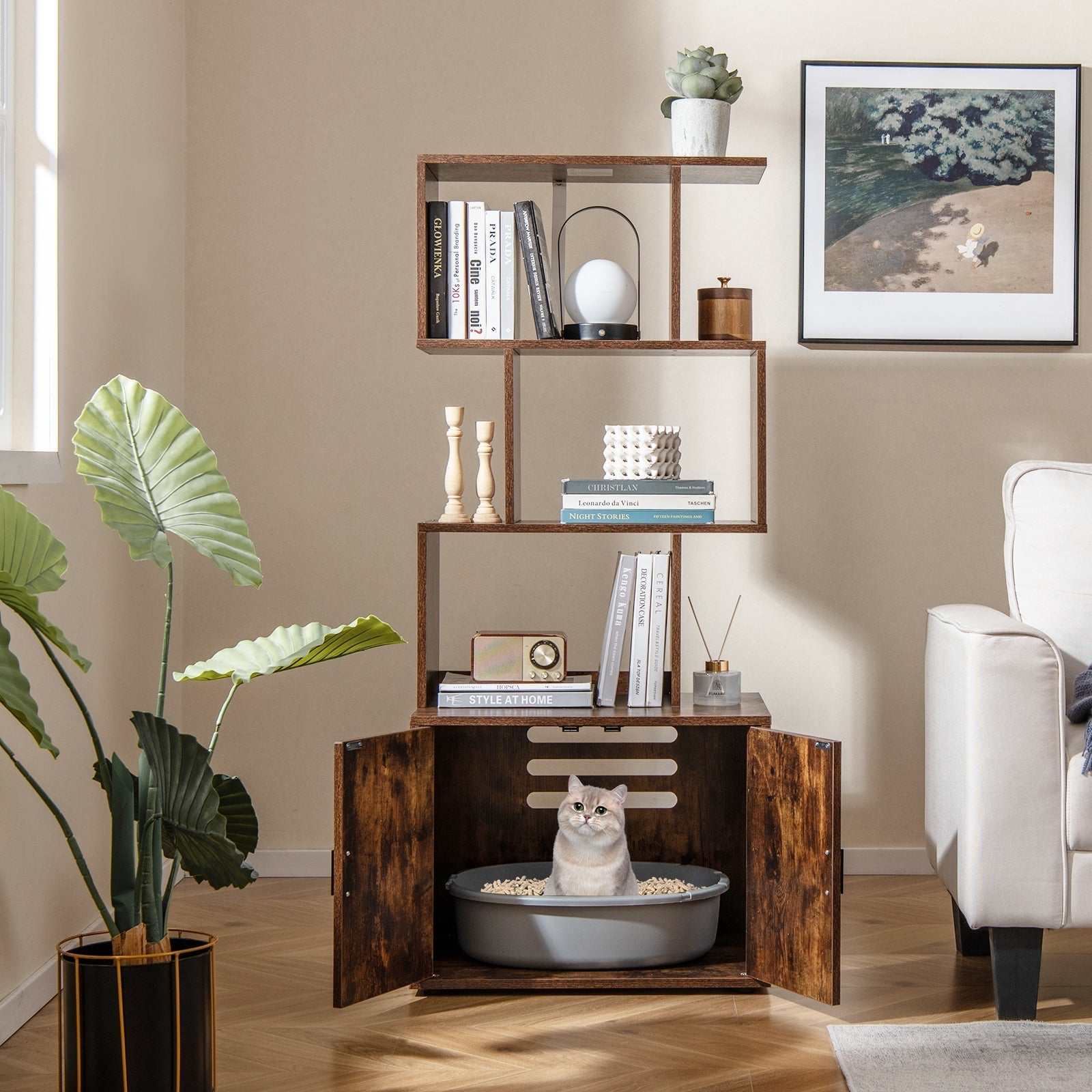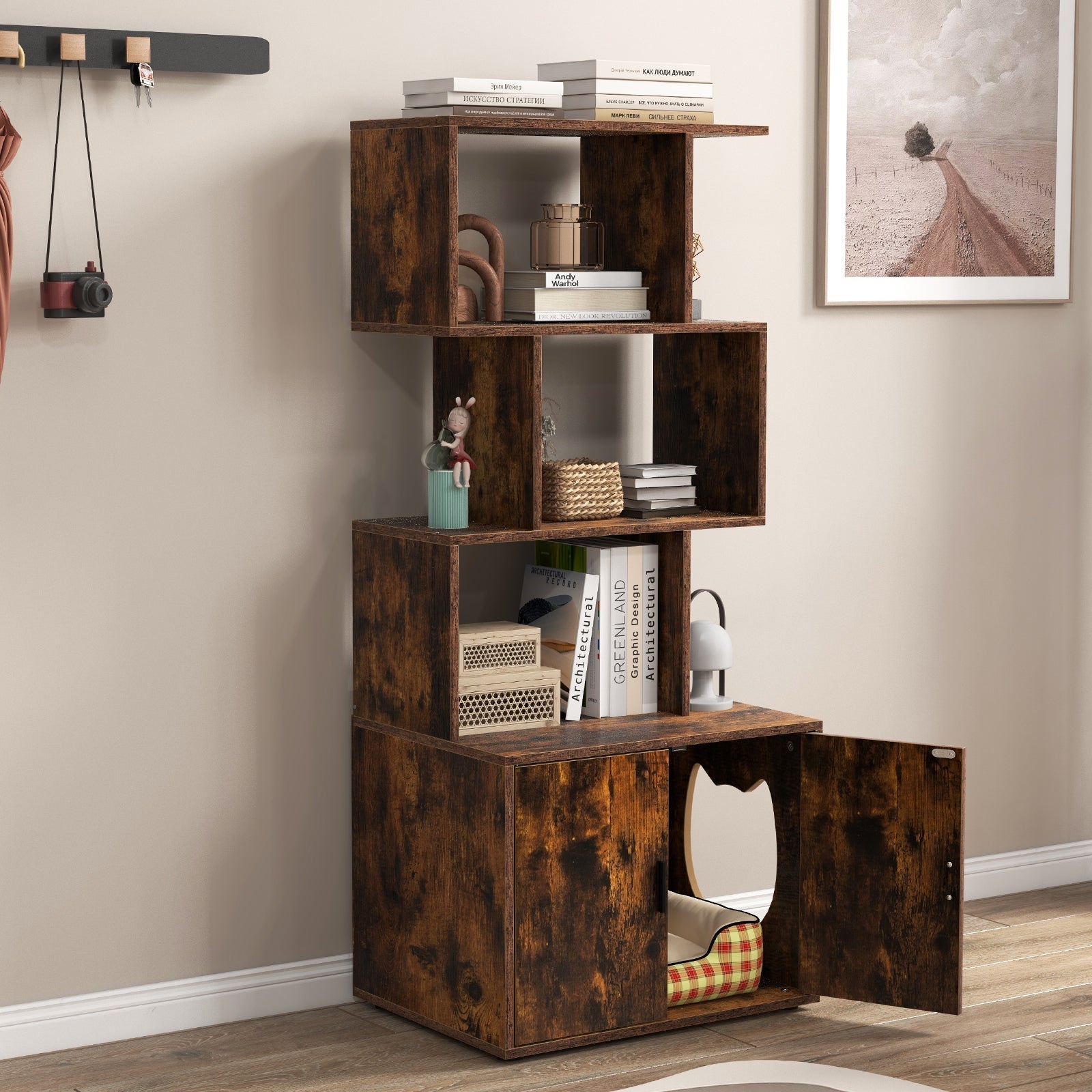 2-in-1 Hidden Cat Litter Box Enclosure with 3 Open Shelves-Rustic Brown