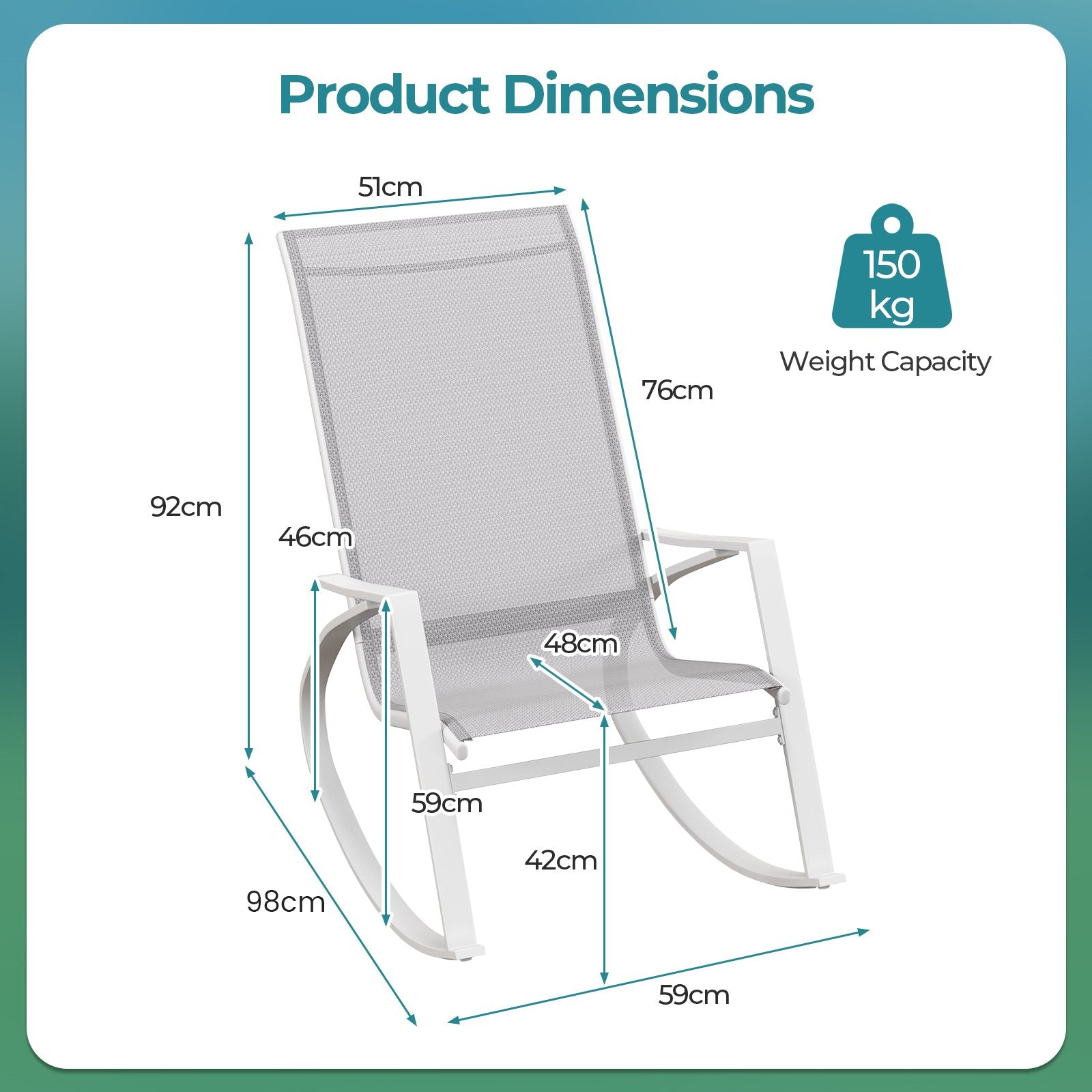 Unwind and relax with this set of 2 patio rocking chairs, a perfect addition to enhance your outdoor relaxing space. These chairs feature premium seat fabric that is both skin-friendly and built-to-last, alongside a heavy-duty metal frame for optimal stability. The ergonomic design supports your body’s natural posture, ensuring comfort during prolonged use. With elegant and circular design, the rockers integrate seamlessly into various outdoor settings such as poolside, backyard, and porch. Bring a touch of sophistication and relaxation to your patio with these well-designed rocking chairs, ensuring a peaceful escape in your own backyard. Enjoy Relaxing Rocking: Experience ultimate relaxation with theses 2 patio rocking chairs featuring stable and gentle rocking motion. The bottom stoppers and non-slip rubber mats ensure that you can rock with safety and ease. Premium Seat Fabric: Crafted with high-quality fabric, the seat and back of chairs offer durability and comfort. The seat fabric is not only skin-friendly and breathable, but also rip resistant and quick drying. Ergonomic Sling Design: Designed with your comfort in mind, the rocking chairs boast an ergonomic and cozy seat that conforms to your body’s natural posture, providing extended comfort and support during use. High-Level Stability: Constructed with heavy-duty metal frame and equipped with high-strength back support, these rockers maintain stability on various surfaces, ensuring safe and secure seating anytime. Elegant Patio Addition: With aesthetically circular design, these appealing patio rockers blend effortlessly with any outdoor settings, such as poolside, backyard and porch. Dimension of each rocking chair: 98 x 59 x 92 cm (L x W x H).