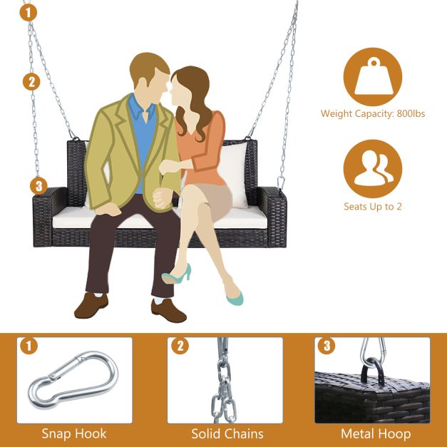 2-Seat Patio Rattan Porch Swing with Two Solid Steel Chains-White
