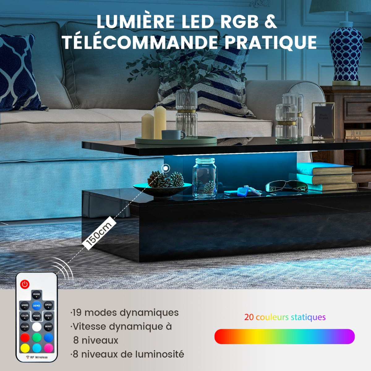 This 2 tier coffee table with 20 color led lights 110x60x40cm contemporary living room table with remote control glossy black is designed to keep your space organised while delivering reliable everyday functionality and a clean, modern look.