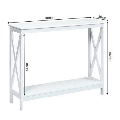 This is an elegant console table which will add glamour to your space!Crafted from high quality P2 MDF, this table is sturdy and durable with a long service life. The X-shaped structures on both sides ensure overall stability without easy shaking. In addition to the spacious tabletop, it’s also worth mentioning that the open shelf provides additional storage space for books, toys, crafts, etc. The smooth surface is easy to clean, so that you can wipe it effortlessly with a soft, damp cloth when there is dust on it. As a perfect combination of aesthetics and practicality, this console table can’t be missed! Sturdy and Durable Construction: This console table is made of high-quality P2 MDF to last for years of use. The X-shaped structures on both sides provide a more stable support while increasing aesthetics, so you don't have to worry about the table shaking and deforming. Practical Multifunctional Console Table: This console can be used as a sofa side table, entryway table, display rack, TV stand or even works as a kitchen pub table. The compact size makes it not occupy too much space, which is the ideal storage solution for small spaces. Large Storage Space: The spacious tabletop is suitable for placing tea cups, laptops, albums, vases, etc. The lower open shelf allows you to easily access items without obstacle, while providing additional storage and display space for books, sundries basket and crafts. Rustic Industrial Style: Abandoning the complicated decoration, our console table adopts concise lines and classic finish to create a simple and stylish appearance. It can complement each other with a variety of decoration styles, which is ideal for living room, entryway, hallway, etc. Easy Cleaning and Maintenance: With detailed assembly instruction and all hardware delivered, it is easy to set up your console table in a short time. The smooth surface facilitates daily maintenance and stains left on the tabletop can be quickly wiped with a soft damp cloth.