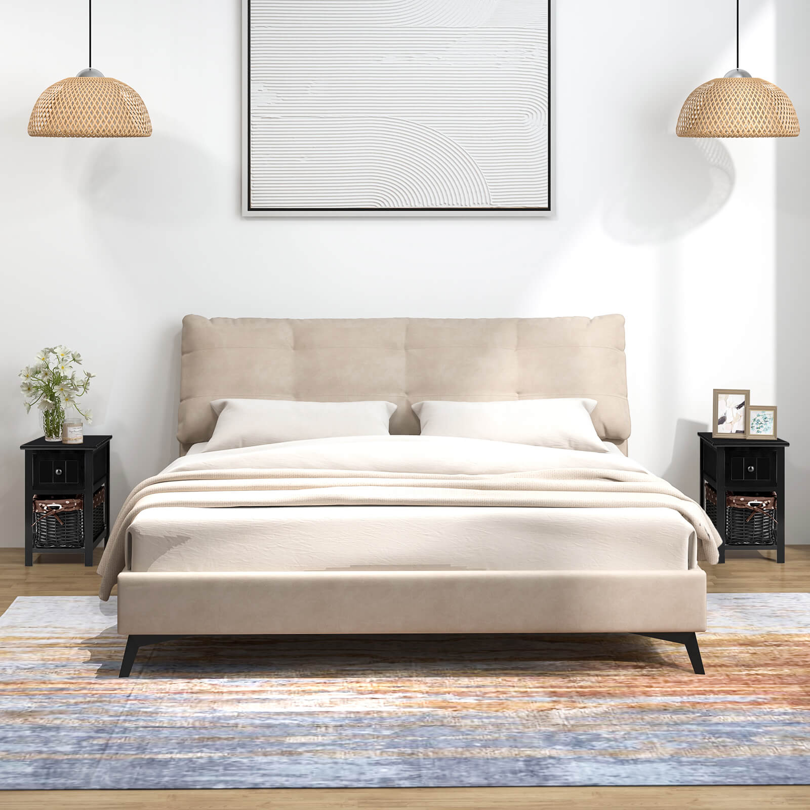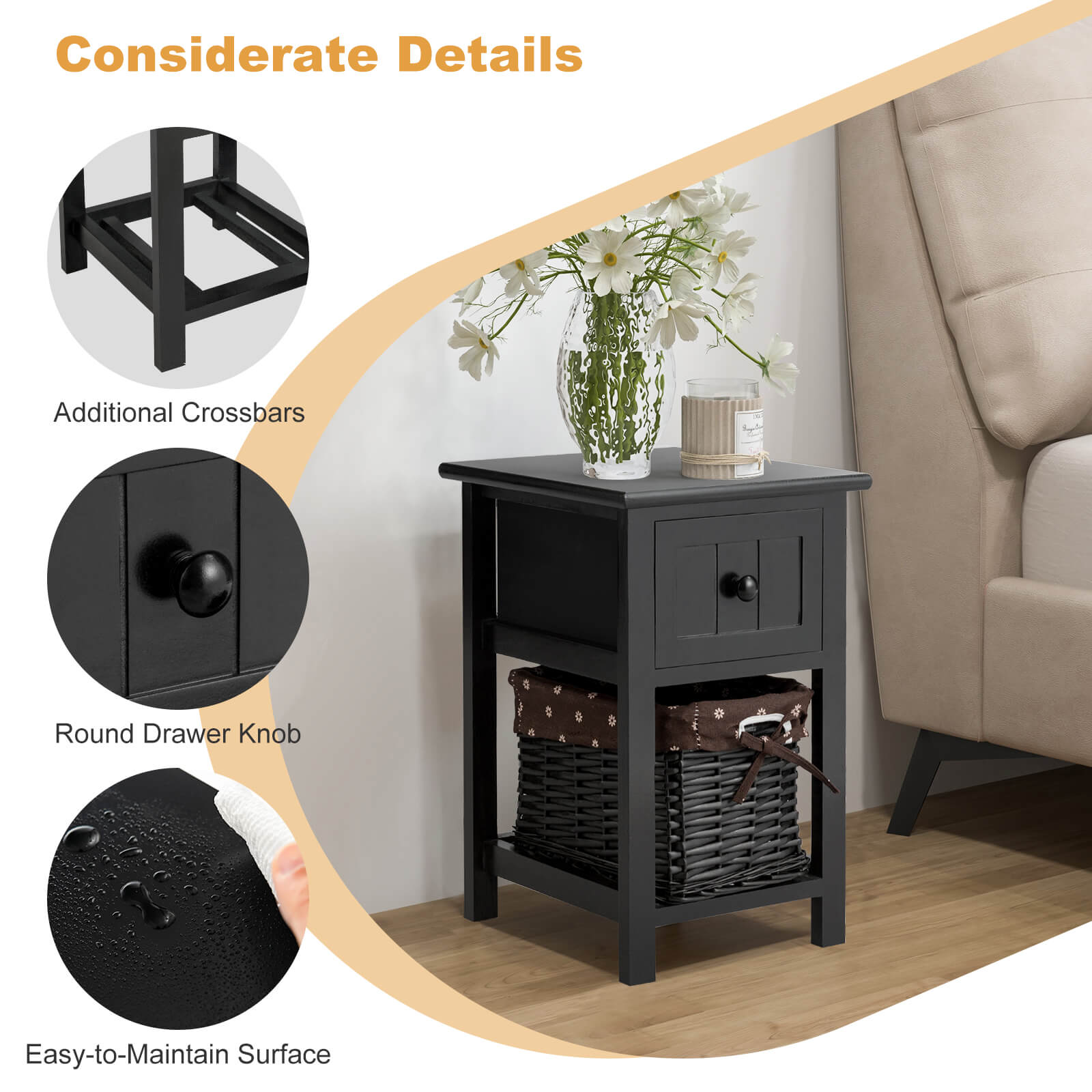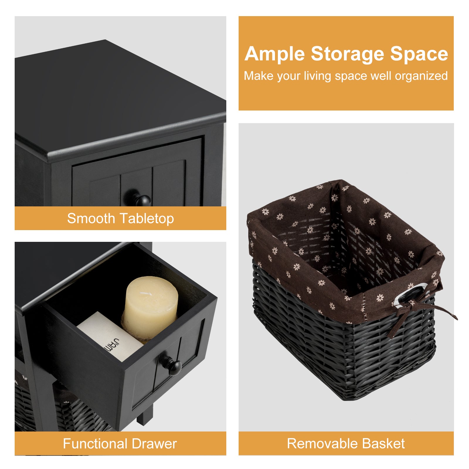 This 2 tiers wood nightstand with 1 drawer and 1 baskets for home-black is designed to keep your space organised while delivering reliable everyday functionality and a clean, modern look.