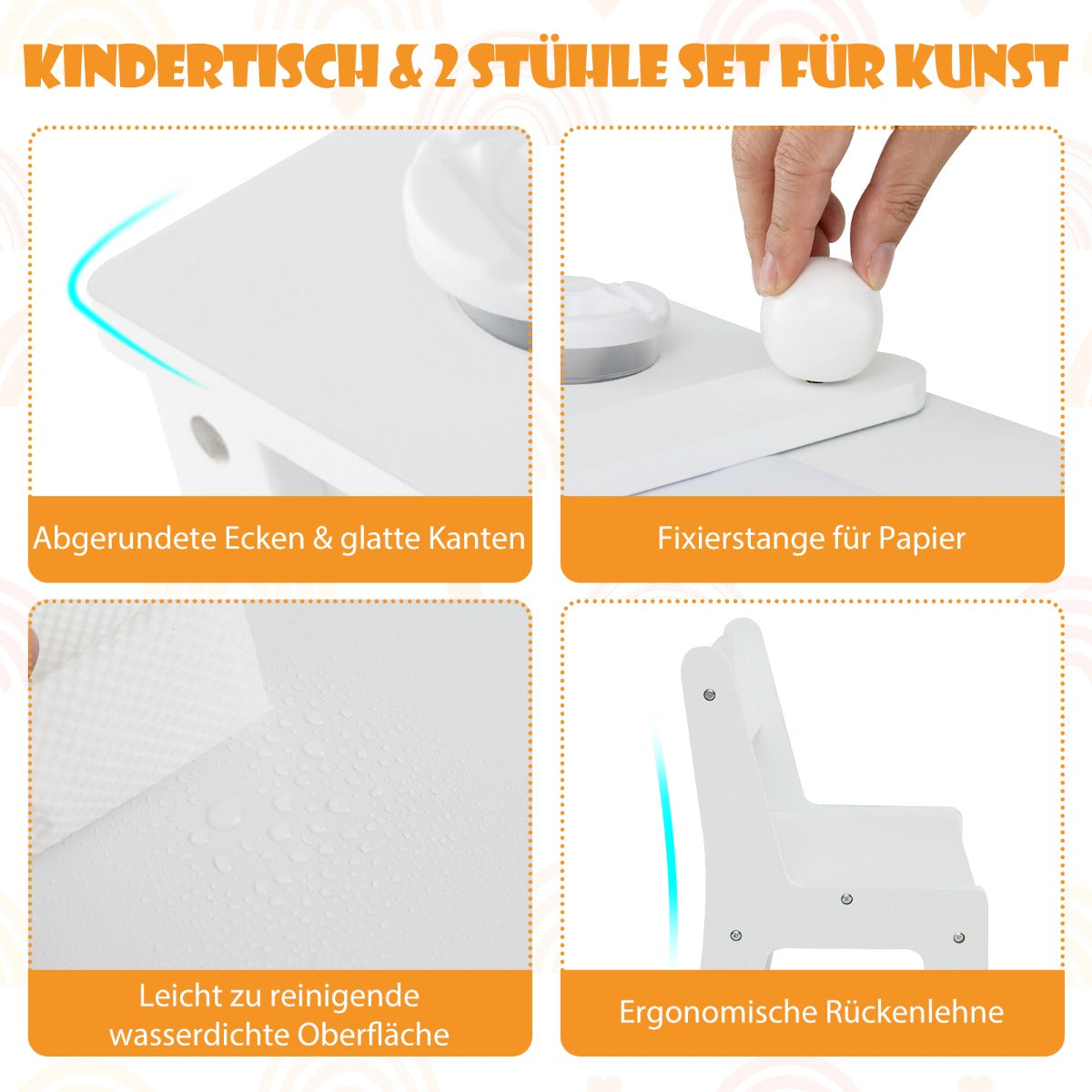 - Net weight: 23.5kg Delivery scope : 1 x Art Table 2 x Chairs 1 x Paper Roll 5 x Paint Cups 6 x Storage Boxes 1 x Instructions