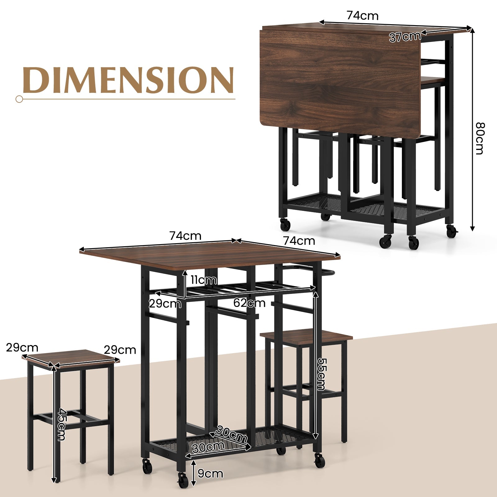 - Material: Engineered Wood, Metal, PP Size of Unfolded Table: 74 x 74 x 80 cm (L x W x H) Size of Wine Rack: 62 x 29 x 11 cm (L x W x H) Size of Each Shelf: 30 x 30 x 55 cm (L x W x H) Height off the Ground (Table): 9cm Size of Each Stool: 29 x 29 x 45 cm (L x W x H) Dimension of Fold-In-Half Table: 74 x 37 x 80 cm (L x W x H) Load Capacity of Extended Tabletop: 100 kg Load Capacity of Wine Rack: 10 kg Load Capacity of Bottom Shelves: 10 kg Load Capacity of Each Stool: 150 kg
