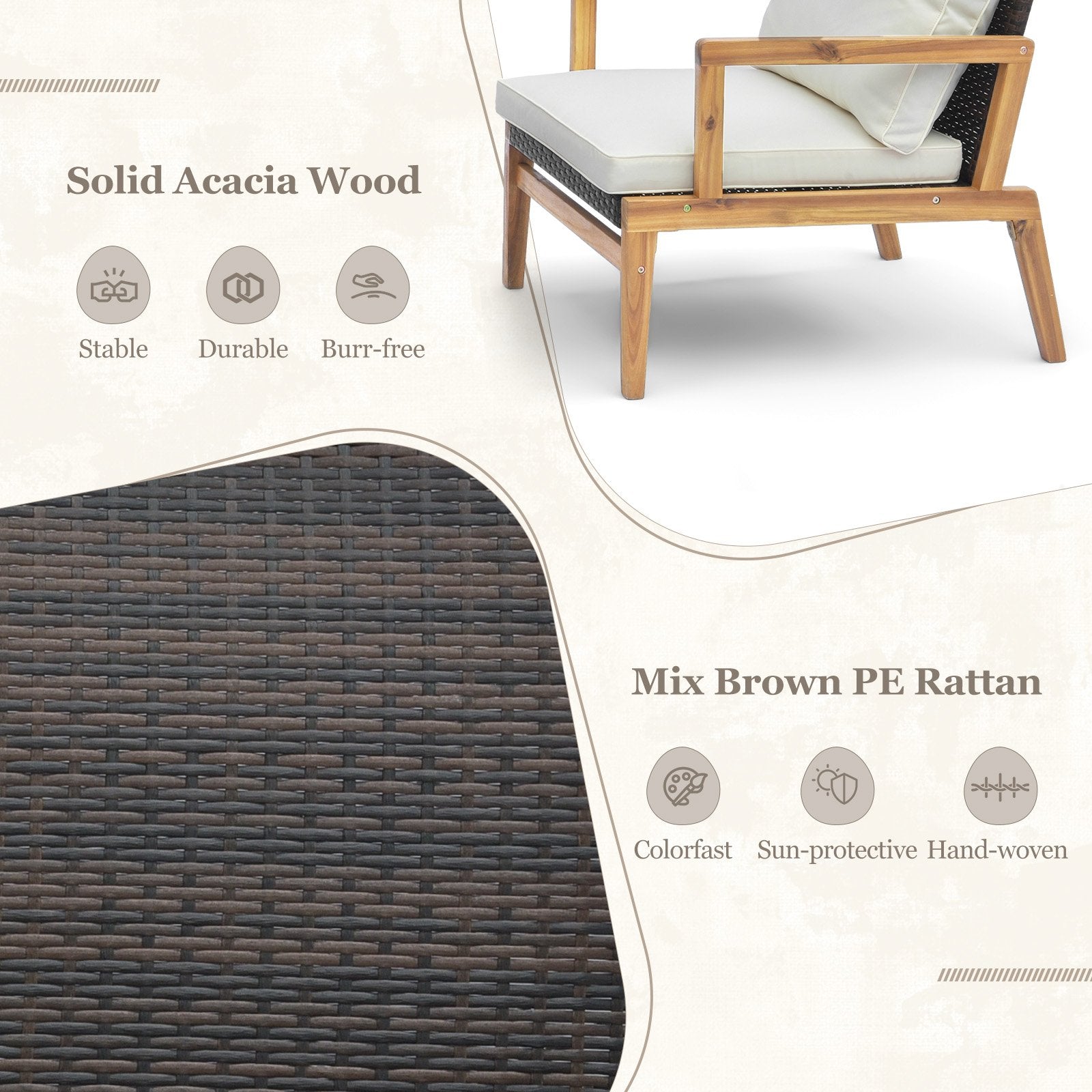 The chairs feature premium mix brown PE rattan seat that is anti-fading, ensuring long-lasting beauty. The comfortable backrest provides strong support, while the cozy seat and back cushions offer unparalleled comfort. The solid acacia wood frame and X-shaped metal frame underneath the seat ensure high-strength and stability. Furthermore, the practical side table with a tempered glass tabletop is perfect for placing drinks and snacks. This wicker patio set is a great solution for relaxing in the backyard, front porch, deck and so on. Rattan-Woven Seat: The sitting area of chairs is made of premium mix brown PE rattan, which is anti-fading, built-to-last and appealing. And the comfortable rattan backrest provides you with cozy and strong support. Unparalleled Comfort: Each patio chair comes with cozy seat and back cushions, which offer you soothing sitting feeling. And elastic and soft fillings make you more relaxed. Plus, the functional zippers are designed for easy maintenance of seat cushion covers, and the fixing straps keep the cushions in place. High-Strength Structure: Both the table and chairs are firmly supported by solid acacia wood frame, which is sturdy and burr-free. Moreover, the X-shaped metal frame under the seat and the adjustable footpads of coffee table highly improve the overall stability. Practical Side Table: The round side table is perfect to place drinks, snacks, magazines, phones and so on, offering you much convenience. And its tempered glass tabletop is elegant and simple to maintain with wet cloth. Awesome Relaxing Choice: This 3-piece patio rattan set looks natural and can withstand long-time use, which is ideal for backyard, poolside, front porch and so on. Note: Please always keep cushions dry to prolong the service time. Due to the light avoidance and light exposure, the color of the cushions is slightly different.