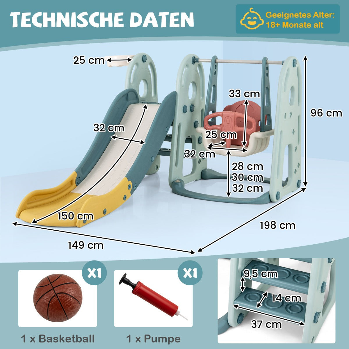 Color: Multicolor Materials: PP, PE Product Dimensions: 198 x 149 x 96 cm (L x W x H) Size of Slide: 150 x 35 cm (L x W) Size of Swing Seat: 32 x 25 cm (L x W) Size of Each Pedal: 37 x 14 cm (L x W) Inner Diameter of Basketball Rim: 25 cm SeatHeightof Swing: 28/30/32 cm Net Weight: 17 kg Weight Capacity: 30 kg Suitable Ages: 18+ Months Old MaximumUser’s Number: 3 Package Includes: 1 x Toddler Slide Set 1 x Basketball 1 x Pump 1 x Instruction
