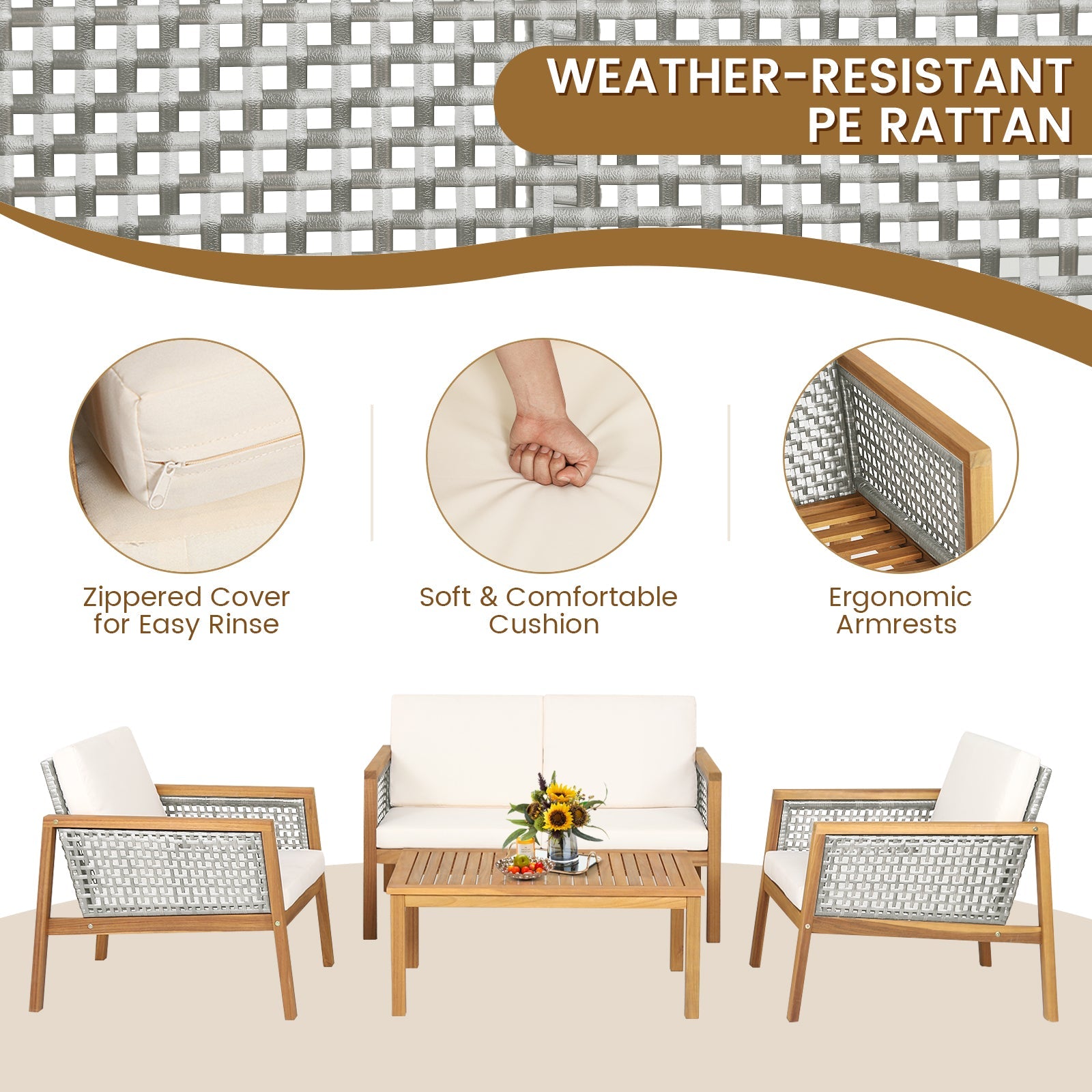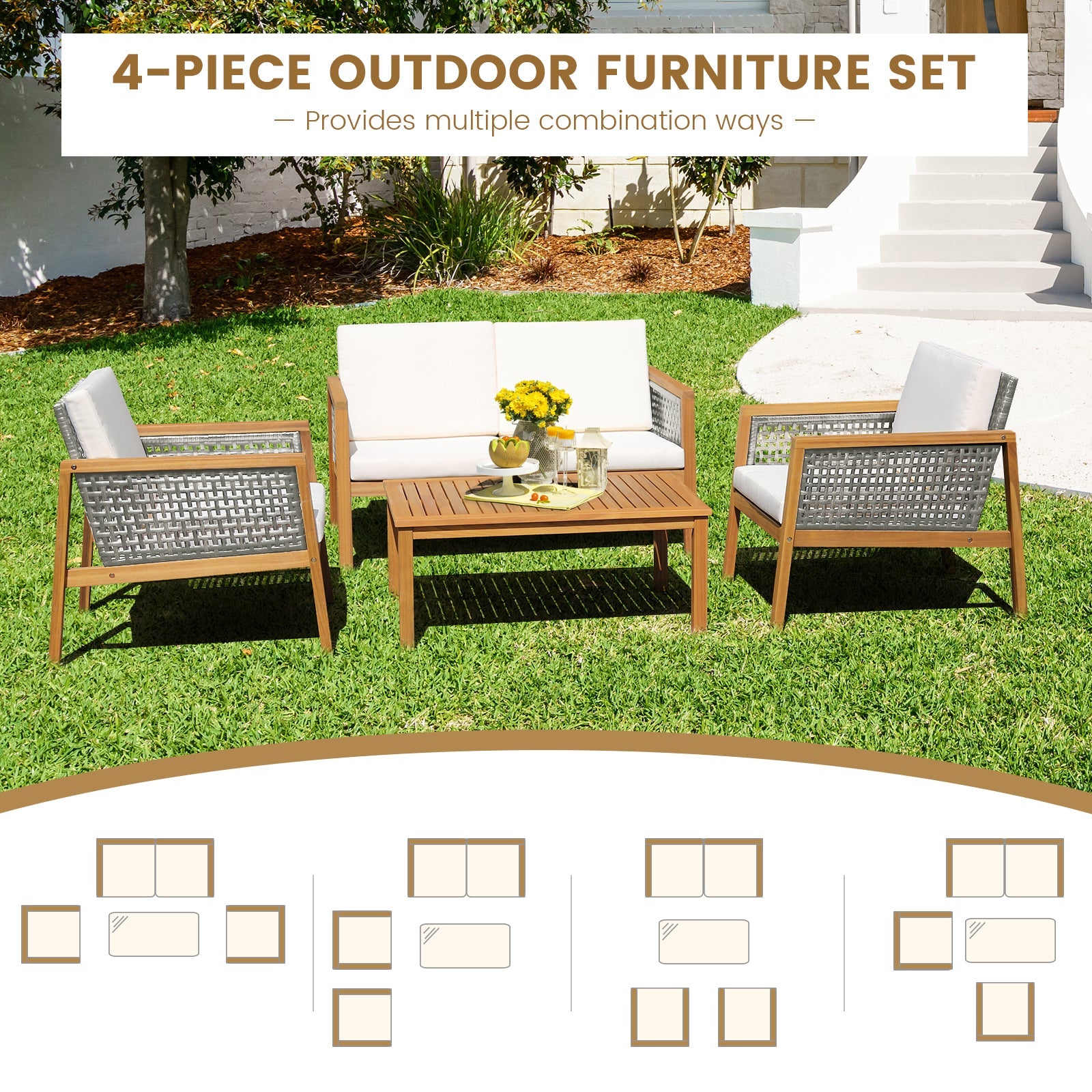 4 Pieces Wicker Patio Furniture Set with Loveseat Coffee Table and Chairs-White