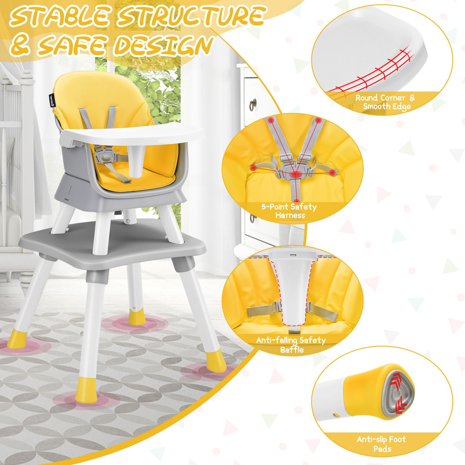 6-in-1 Baby High Chair with 5-Point Harness and Removable Tray-Yellow