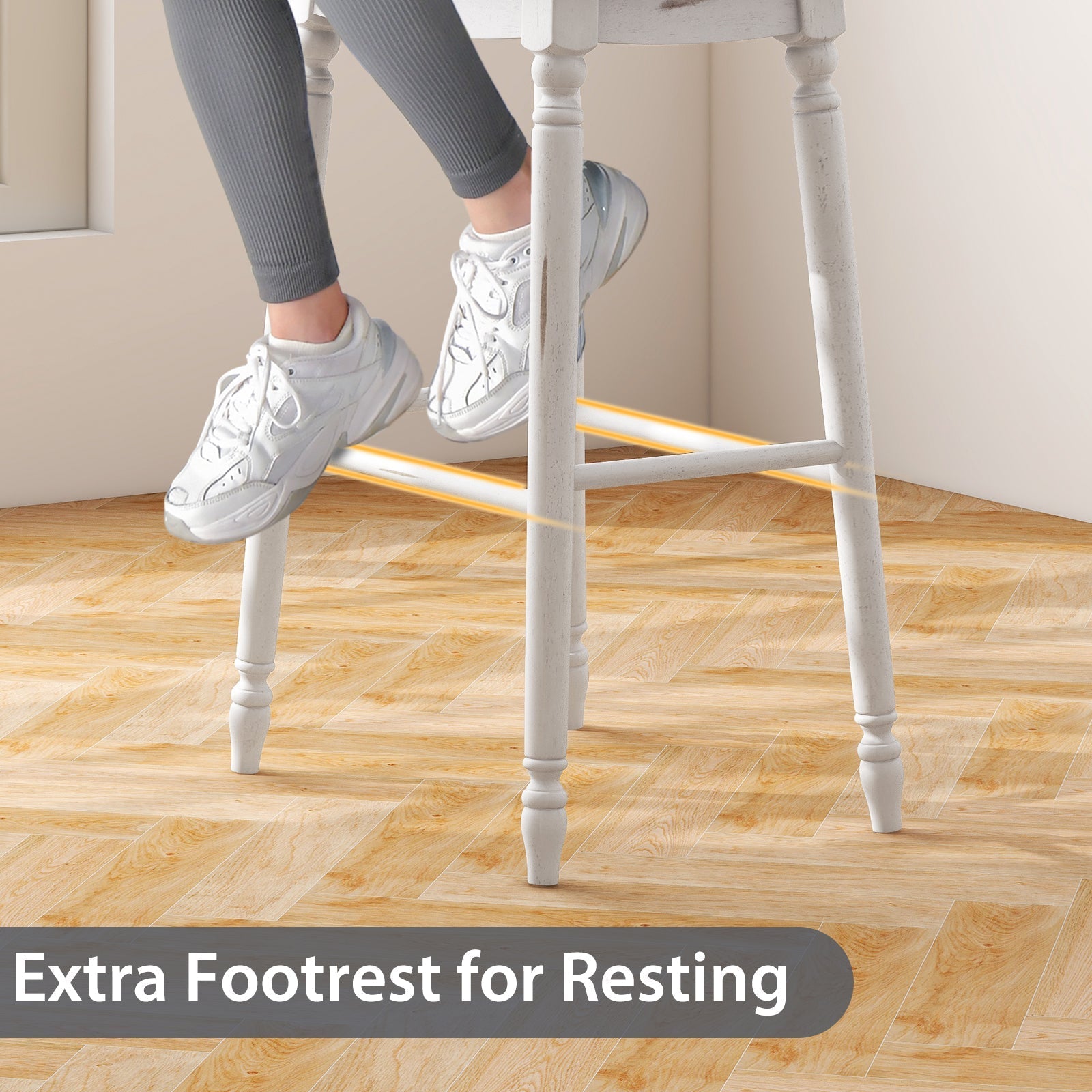 Each stool features antiqued surface and engraving craftsmanship to decorate your kitchen, dining room or restaurant. Each stool is equipped with a soft cushioned seat and added footrest to help you enjoy drinking or have a rest relaxed. Besides, solid rubber wood legs can support up to 115 kg and provide long-term use. Plus, 61cm counter height or 74cm bar height stools are available. If you are looking for a bar stool set like this, do not hesitate to place an order! Elegant and Retro Appearance: With antiqued surface and exquisite engraving craftsmanship, our bar stools add a touch of elegance and texture. You can place them in your kitchen, bar, dining room or restaurant. Comfortable Padded Seat: Covered with smooth PVC, our soft padded seat cushions offer a skin-friendly touch. And we also fill the cushions with bouncy sponge to help them well support your hip. Stable Rubber Wood Frame: Supported by solid rubber wood legs, our strong bar stools are sure to withstand a weight of 115 kg. Plus, the rubber wood frame also helps the stool stay sturdy on the ground. Extra Footrests for Resting: There are additional footrests to rest your legs and feet, ensuring further relaxation. And the extra footrests are also made of durable rubber wood material. Backless Space-saving Stools: When not in use, our backless bar stools can be stored under the kitchen counter or dining table. With 61cm/74cm seat height, our stools are ideal for 89-99cm counters/101-110cm bars.