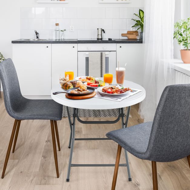 Upgrade your dining experience with the folding dining table. Constructed with weather-resistant HDPE, the round table can be used for a long time, especially perfect for outdoor use. Besides, reinforced by heavy-duty metal legs and a honeycomb structure on the back of the tabletop, this folding table is a reliable choice for various occasions, while the non-slip foot pads ensure stability on uneven ground. More importantly, the folding design allows for easy storage and carrying, making the plastic table ideal for picnics, weddings, camping trips, garden gatherings, and everyday use at home. Lastly, this outdoor dining table has no installation required, and the maintenance is also a breeze! Bullet Point: Portable Folding Design: This outdoor dining table can be easily folded up to store when not in use, saving room space. If you plan to go camping, you can effortlessly carry the folding dining table with a lightweight design of only 7 kg. All-weather HDPE Material: Rain or shine, the thickened tabletop made of high-grade HDPE can resist all weather elements, showing excellent robustness and durability. Besides, the desktop is smooth and waterproof, making cleaning a breeze. Sturdy Metal Structure: Reinforced with robust metal legs and an X-shaped structure, the outdoor dining table has an outstanding weight capacity of up to 75 kg. Plus, the round dining table is also equipped with non-slip foot pads which can ensure stability for long-lasting use. Ideal for Indoor and Outdoor Use: This plastic round table is not only suitable for outdoor use, such as the backyard, party, RV travel and campsite, but also for indoors, like the kitchen, restaurant, dining room and living room. Thus, the folding dining table provides an ideal area for small gatherings. No Extra Installation Required: Measuring 81 x 73,5 cm (Dia. x H), this portable round table is ready for use straight out of the box, requiring no additional setup, so you can save time and energy to focus on dining and entertainment.