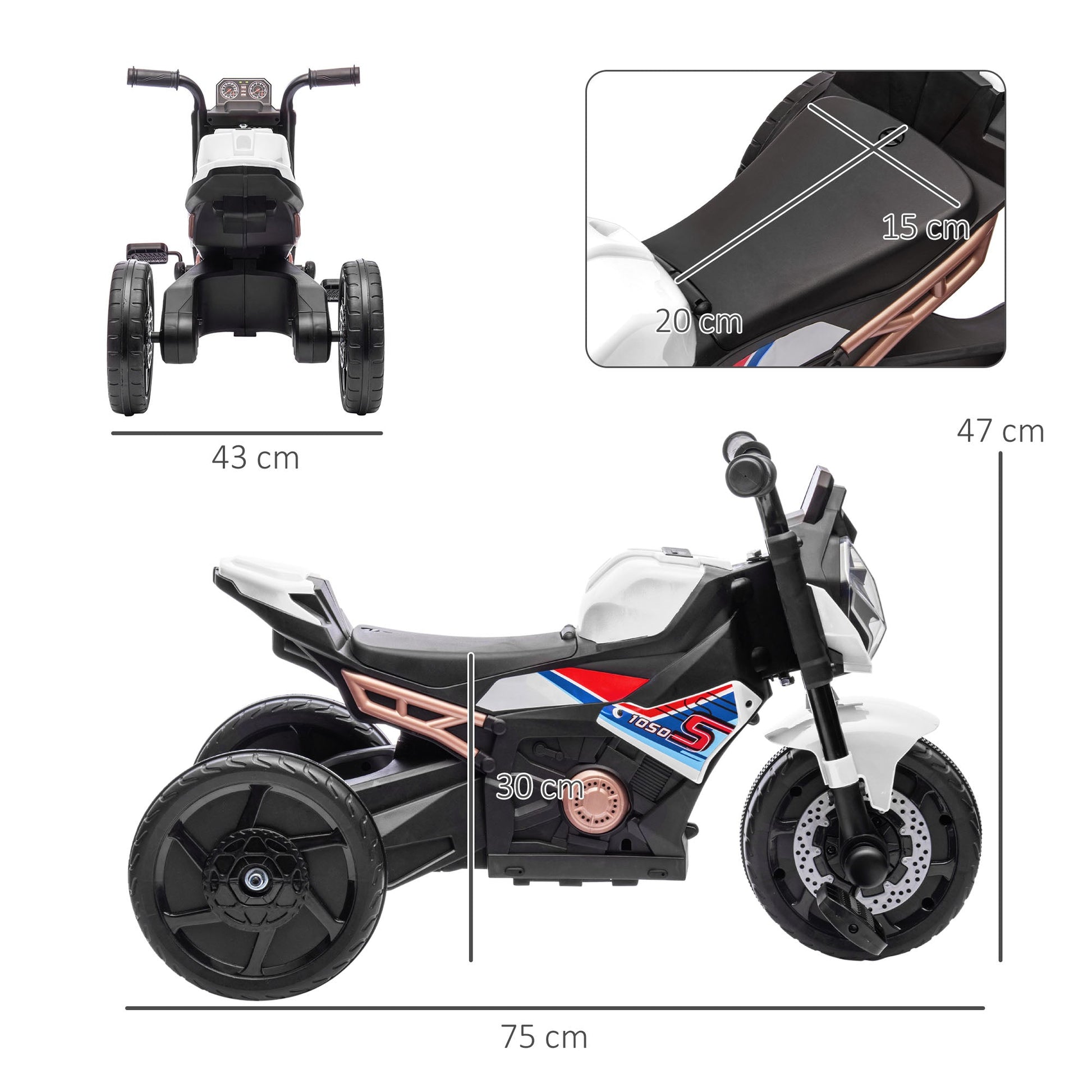 - Overall dimensions: 47H x 75L x 43Wcm. Seat: Off the ground: 30H x 15W x 20Dcm. Wheel: â20cm