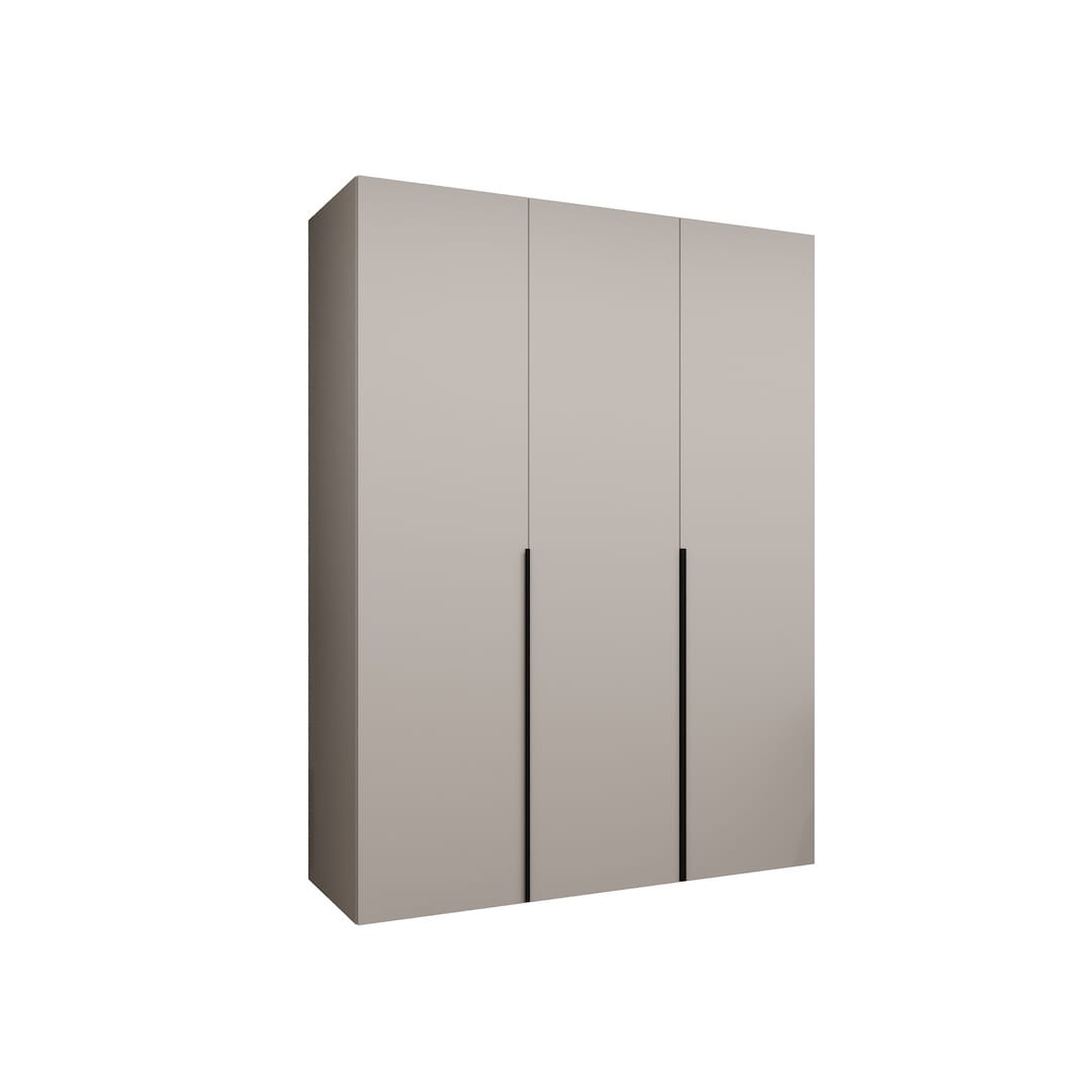 Crafted to enhance your bedroom's aesthetic while providing practical storage, this wardrobe features three hinged doors and an elegant finish. With two shelves and hanging rails, it keeps your space organised and stylish. The black aluminium handles and soft-close hinges add a touch of luxury, making it a perfect addition to any contemporary home.